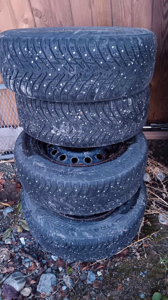 205/65/R15 Tires w/studs. Bolt pattern looks to be 5x4.5. Tires are in excellent shape, studs have at least one season left and wheels are rough but fine for winter. Pickup in Eagle River. Price is firm. Snow's coming!