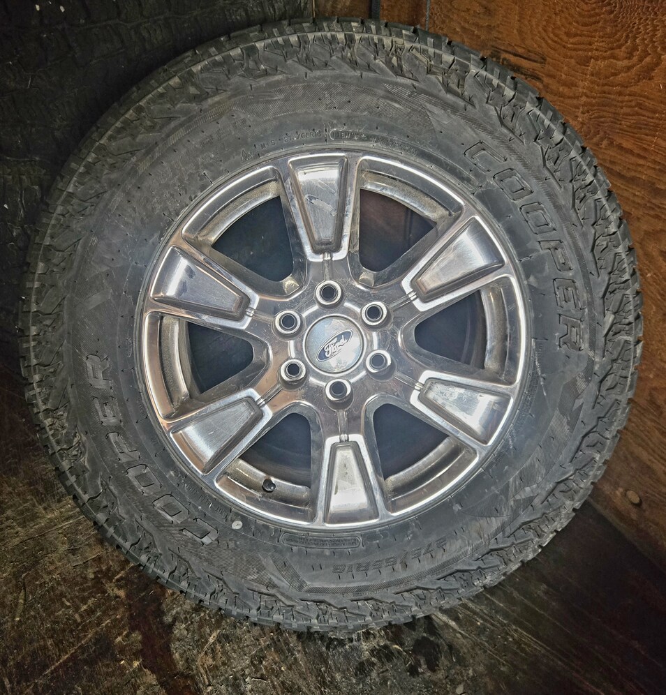 4-2024 Cooper Discoverer Road+Trail AT 275/R18 tires mounted on 2016 Ford F150 chrome wheels. Diversified Tires new at $1246 and now $150 each= $600. 2016 Ford chrome rims $100 each @ $400.