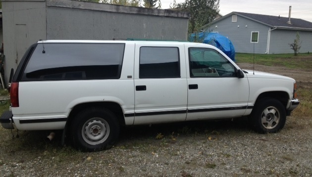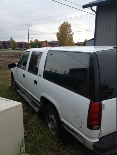 94 Chevy Suburban 1500 With A 50 Gallon Fuel Tank. This Chevy Suburban starts and runs. It needs a tune-up and a muffler. It has 130,000 miles on the engine. The body and the transmission has 300,000 miles on it. It has a little damage to the front bumper on the driver side. The driver side headlight and turning light needs screws. It also need tires. It will make a great plow truck for this winter. The 4 wheel drive works. On a full tank it will go 893 miles.