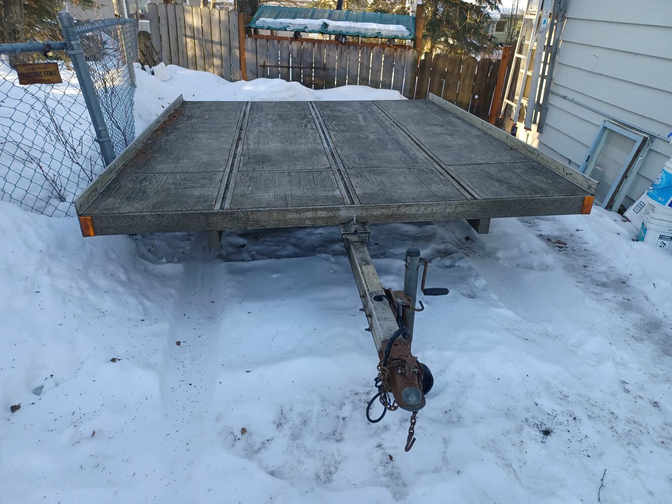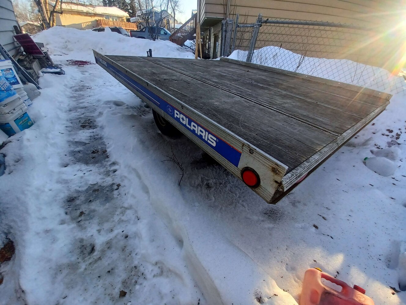 Polaris 10-foot tilt trailer, $1,300 cash, obo. Will handle two snowmachines, ATVs, etc. Lights work. Comes with snowmachine and cargo tie-downs and spare tire/wheels.