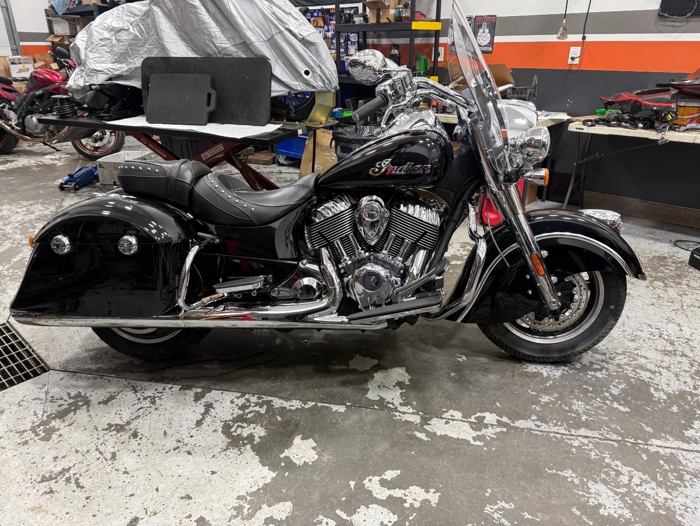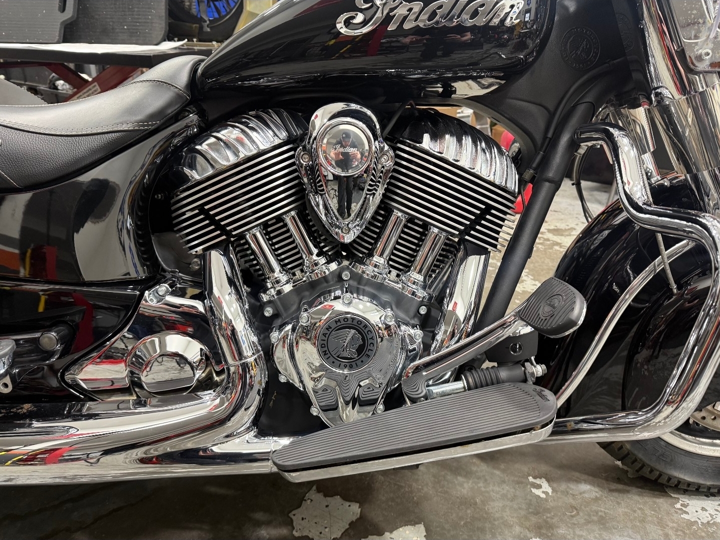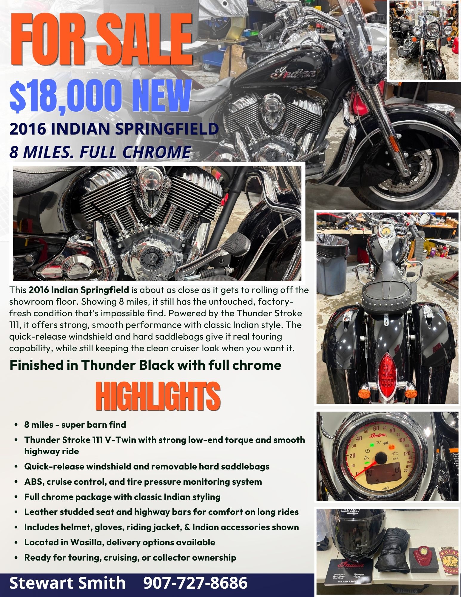This 2016 Indian Springfield is about as close as it gets to rolling off the showroom floor. With only 8 miles, it still has the untouched, factory-fresh condition that’s nearly impossible to find. Powered by the Thunder Stroke 111 V-Twin, it offers strong, smooth performance with classic Indian style. The quick-release windshield and removable hard saddlebags give it real touring capability, while still keeping the clean cruiser look when you want it. Finished in Thunder Black with full chrome. Highlights: 8 miles, super barn find Thunder Stroke 111 V-Twin with strong low-end torque and smooth highway ride Quick-release windshield and removable hard saddlebags ABS, cruise control, and tire pressure monitoring system Full chrome package with classic Indian styling Leather-studded seat and highway bars for comfort on long rides Includes helmet, gloves, riding jacket, and Indian accessories shown Located in Wasilla, delivery options are available Ready for touring, cruising, or collector ownership