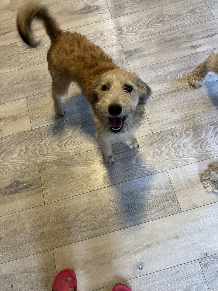 Playful Doodle puppies six months old males, potty trained friendly, ready for adaption $550 fee. Mom is half poodle half beagle color is brown weights 35 lbs. Papa standard poodle white color weights 60 lbs. Text Mila.