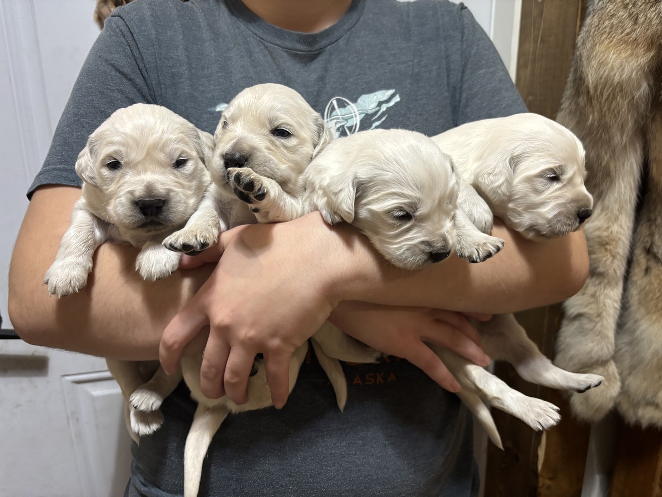 We have a Beautiful litter of golden retrievers (English cream type) babies. They are ready to go home around Thanksgiving! Puppies will be vet checked dewormed and up to date on shots. Dad and mom have both been DNA health tested. Dad also has had OFA testing. If your looking for a new fur baby, let me know
