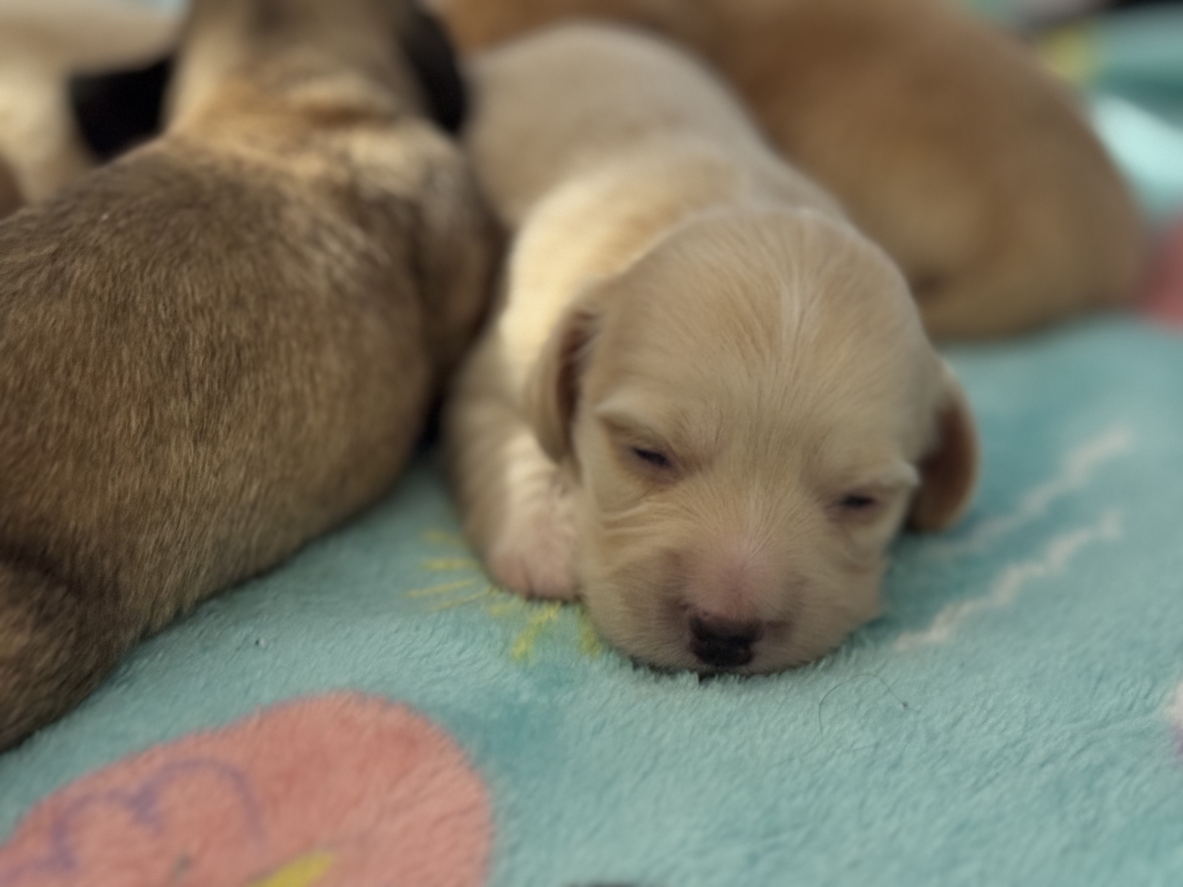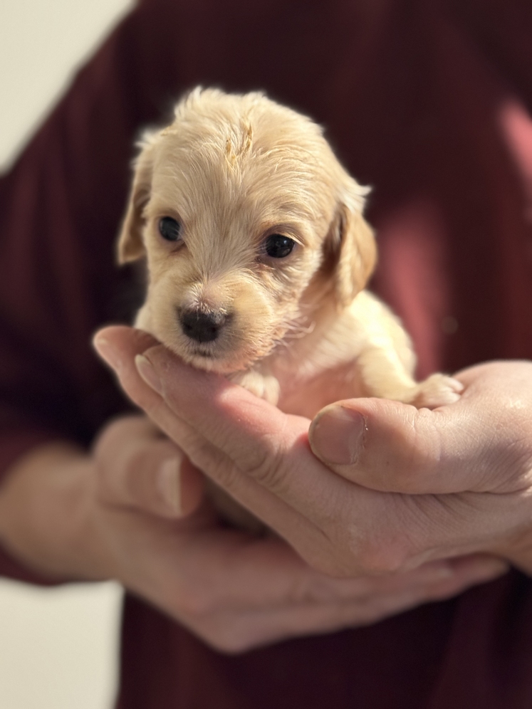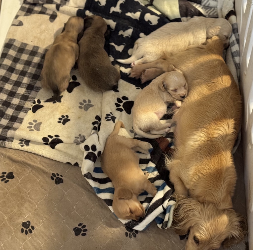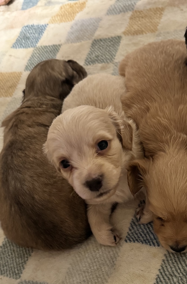AKC Miniature Longhaired Dachshund puppy, female born 10/7. Shes a beautiful English Cream and will be ready to go home Dec 2nd. Puppies are raised in our bedroom and socialized with other dogs, cats and toddlers before going home. Puppies come vet checked with first vaccination, multiple dewormings, microchipped, AKC limited registration and spay contract. Both parents are DNA health tested for genetic diseases and clear! Text is best way to reach us for more pics and info!
