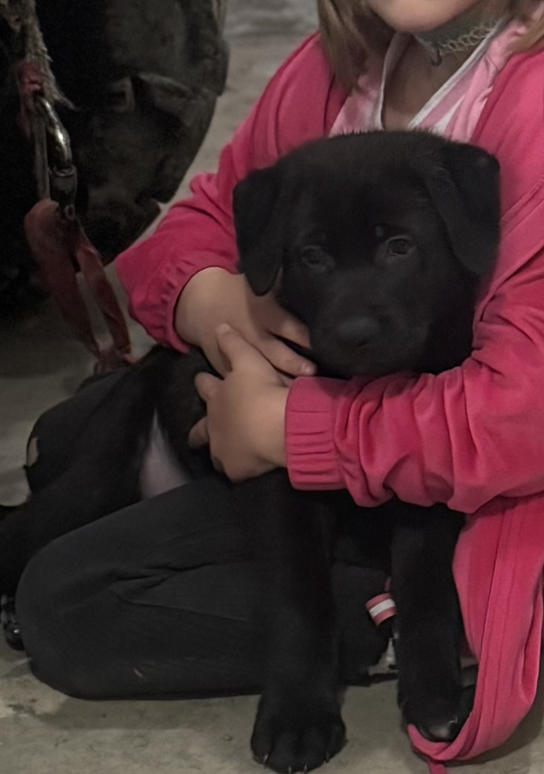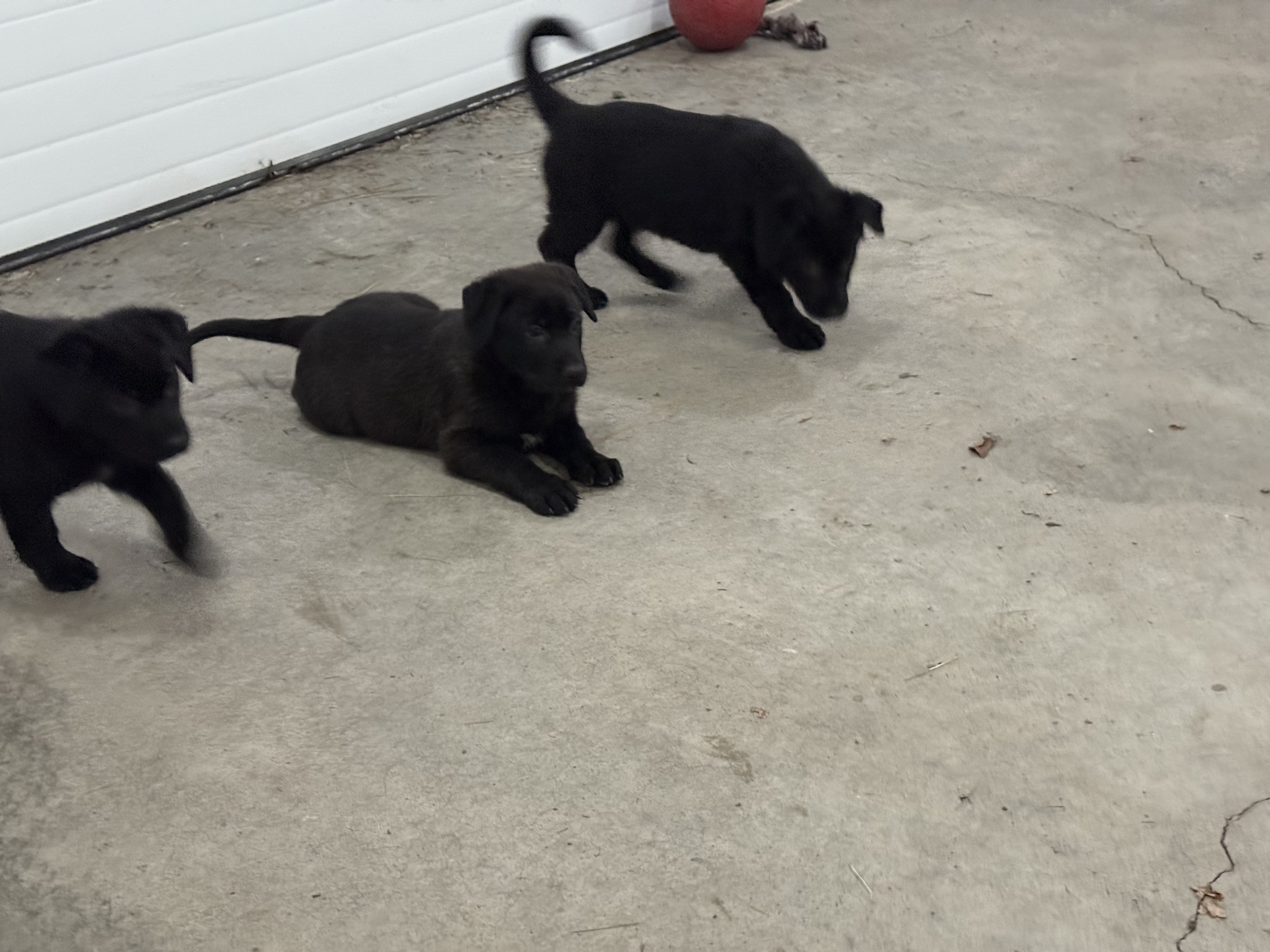 1 Brindle male, 2 females; 1 black, 1 black and Brown w/ one white toe. All 3 pups were born on 6 September 25. Mom is full breed Black German shepherd from Wasilla breeder, Father is a mixed Dutch shepherd with Staffy and Labrador traits. The puppies have all been socialized, dewormed, & have their 1st sets of vaccinations that come with individualized vet records. These pups are smart, fun, quick learners that know both verbal and hand commands for SIT, and HOUSE. Both parents will be present on site, and any additional pics will be sent upon request. Thank you.
