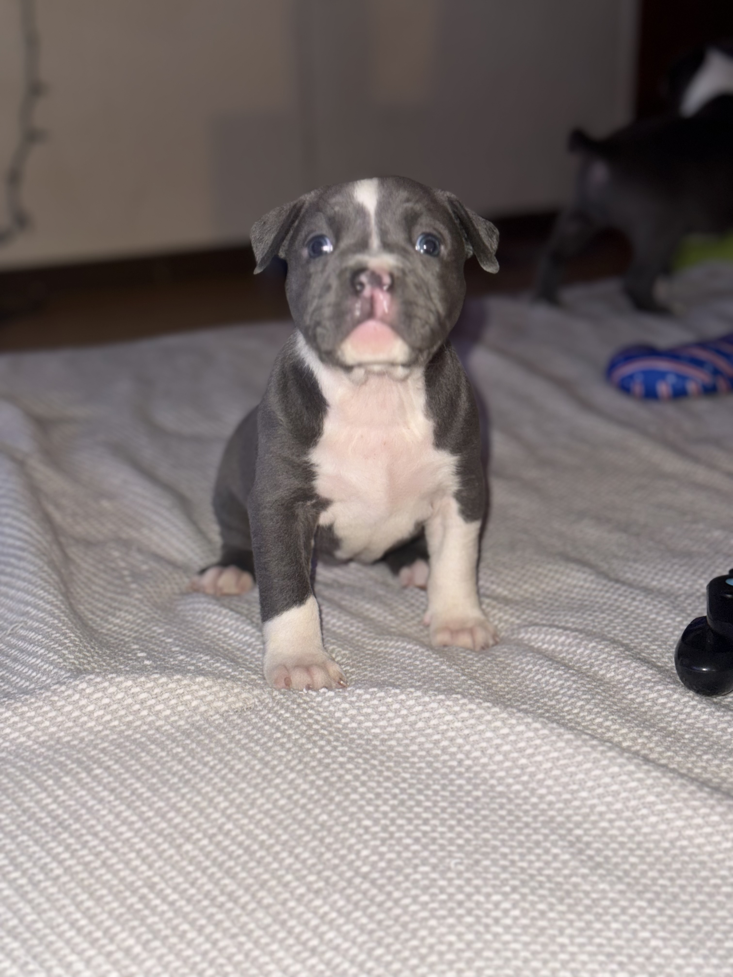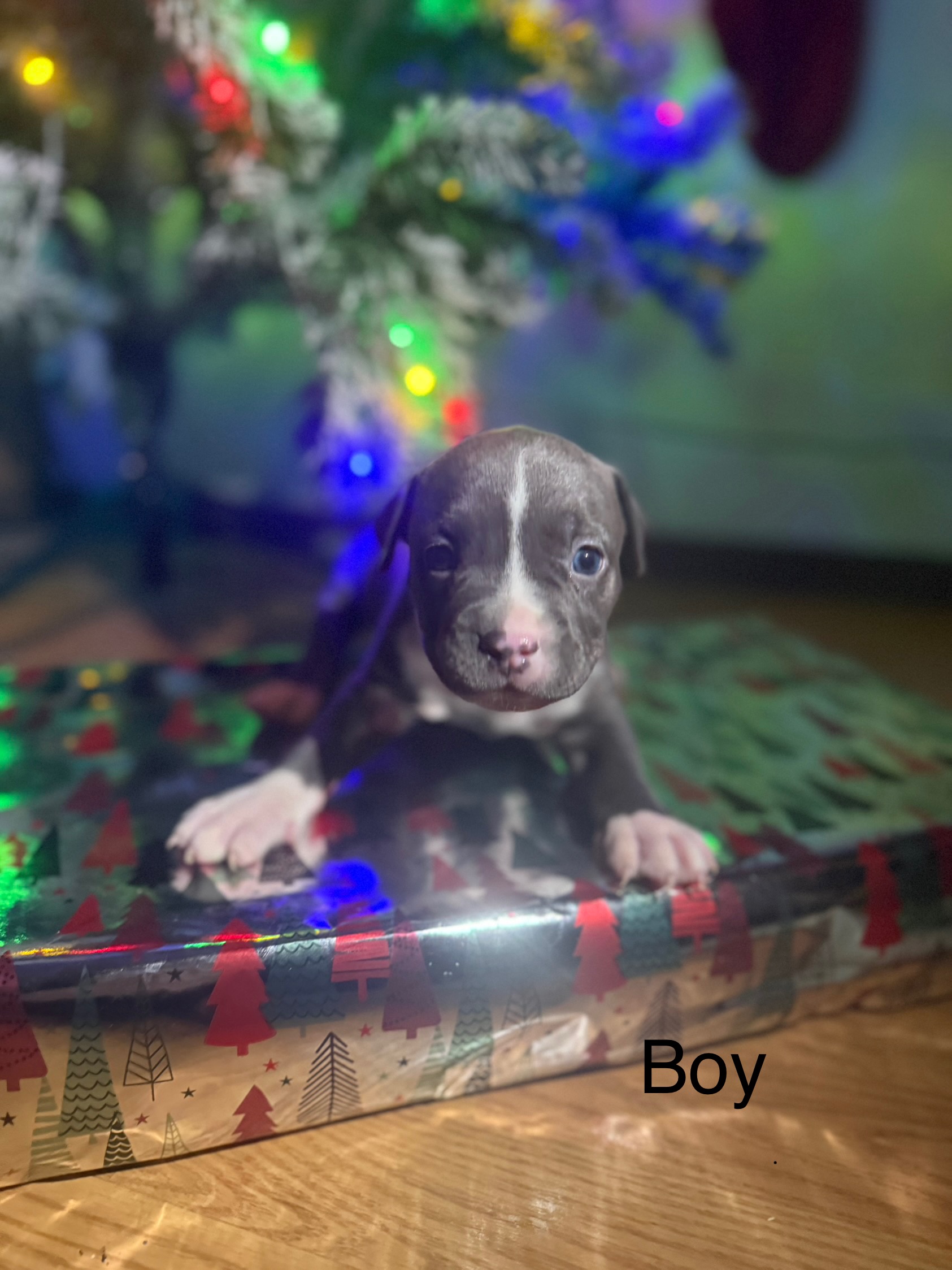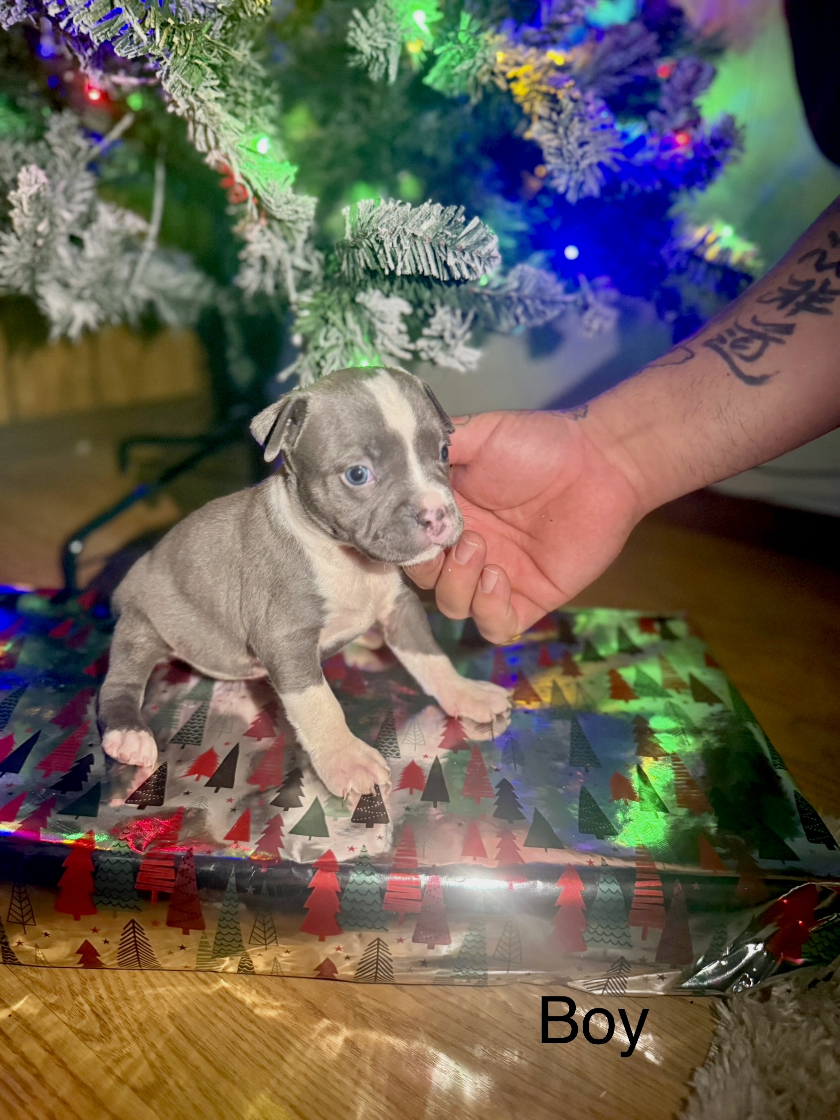 I have 7 boys 1 girl 5 BLUE/White 2 BROWN/white 1 White/brown spots Mom and dad are both very calm and super friendly They will be ready Christmas Eve if you have any other questions or want more pics and vids I’ll send em to you