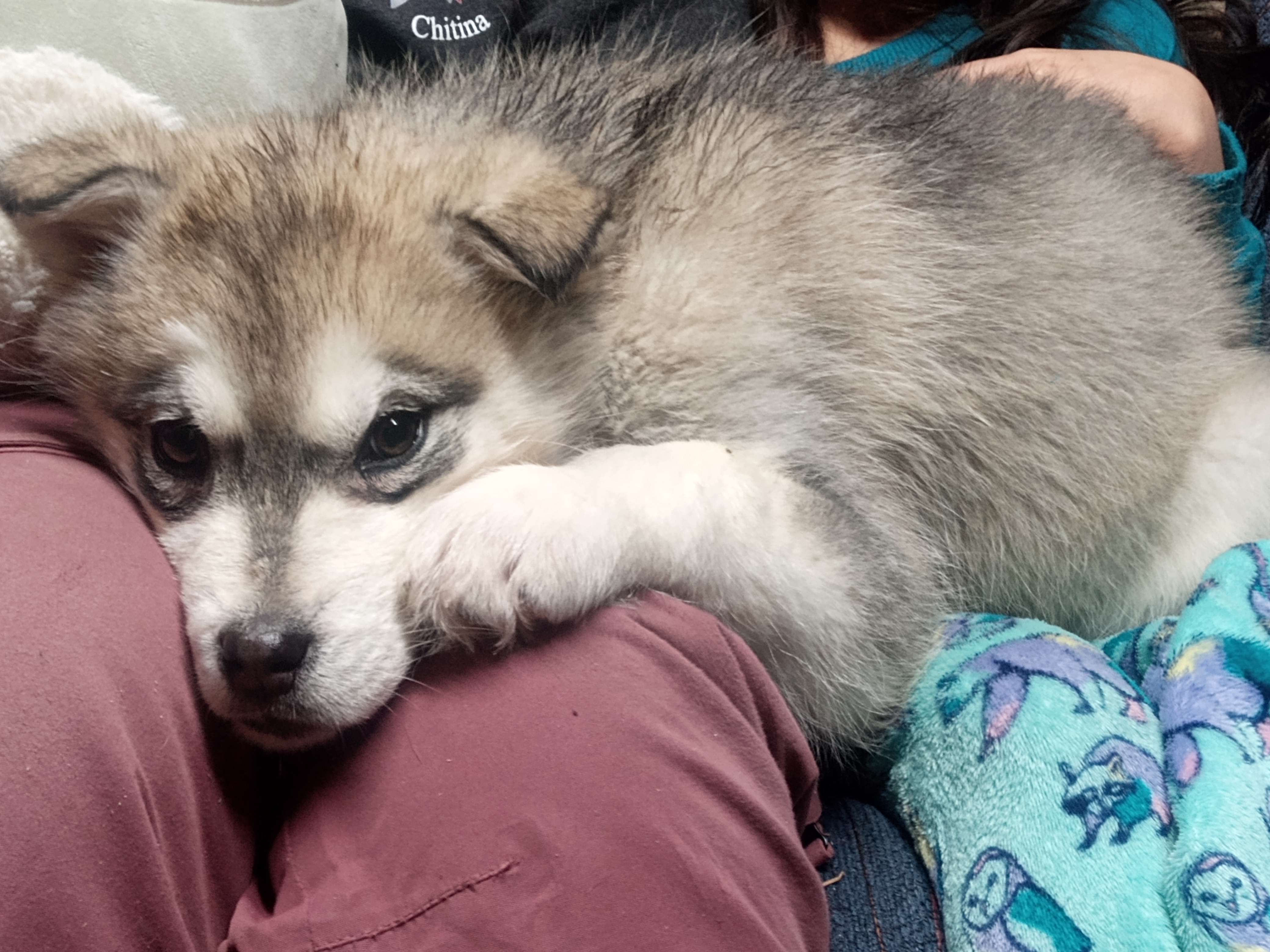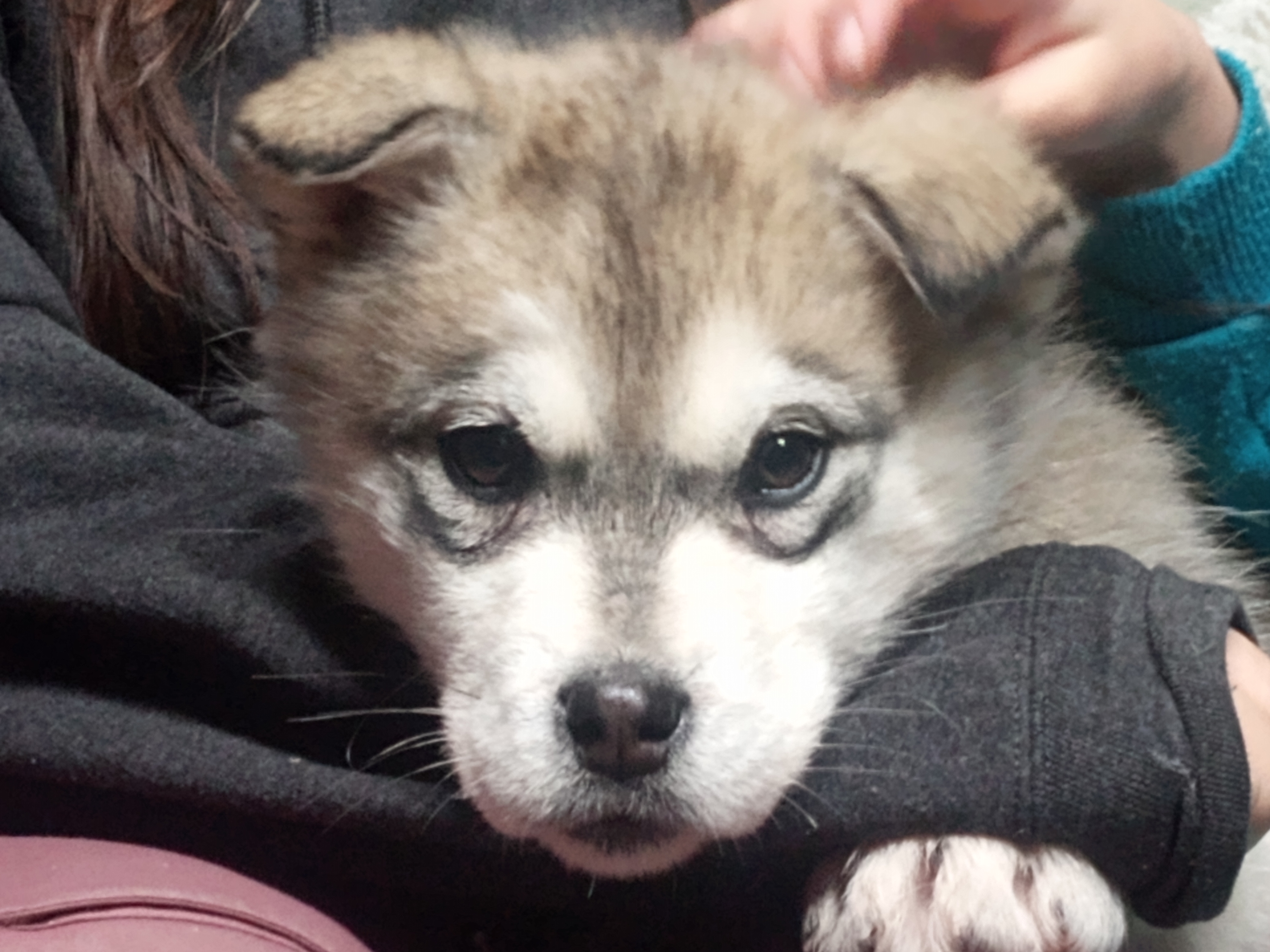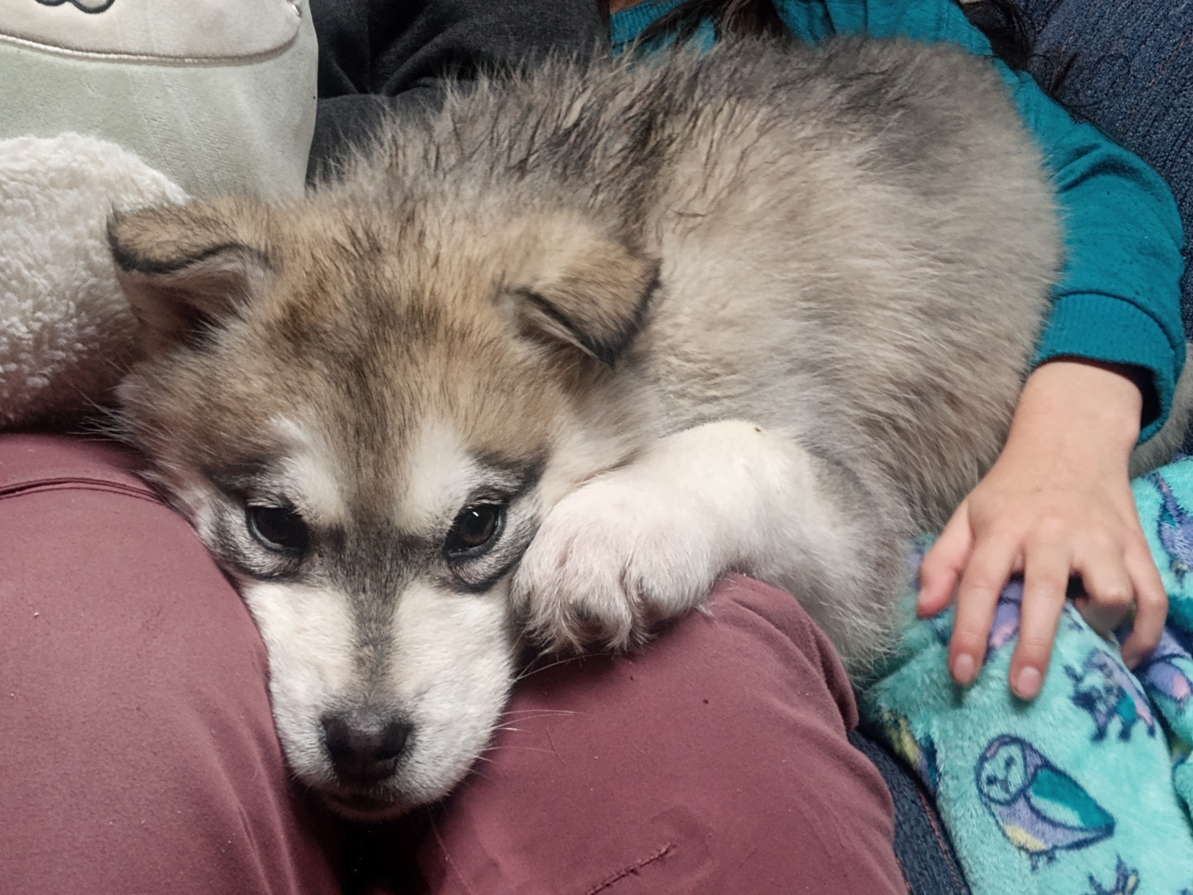 We have a beautiful gray & white female Alaskan Malamute puppy available for adoption in time for Christmas! She is twelve weeks old, and will be large when grown up. She was the largest female of the litter and is very calm, expressive, and gentle. Her parents are AKC registered Alaskan Malamutes, and high quality bloodlines. If you're looking for a great family dog, or just a loyal companion, send me a text.