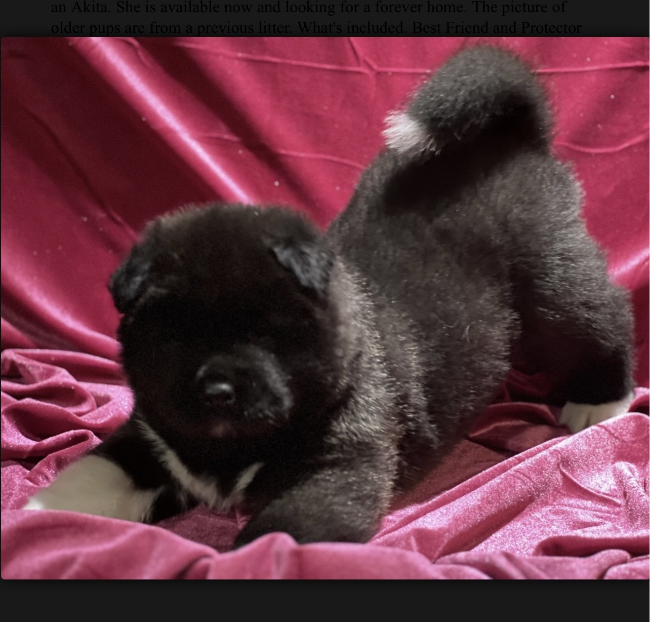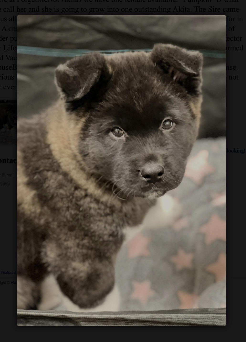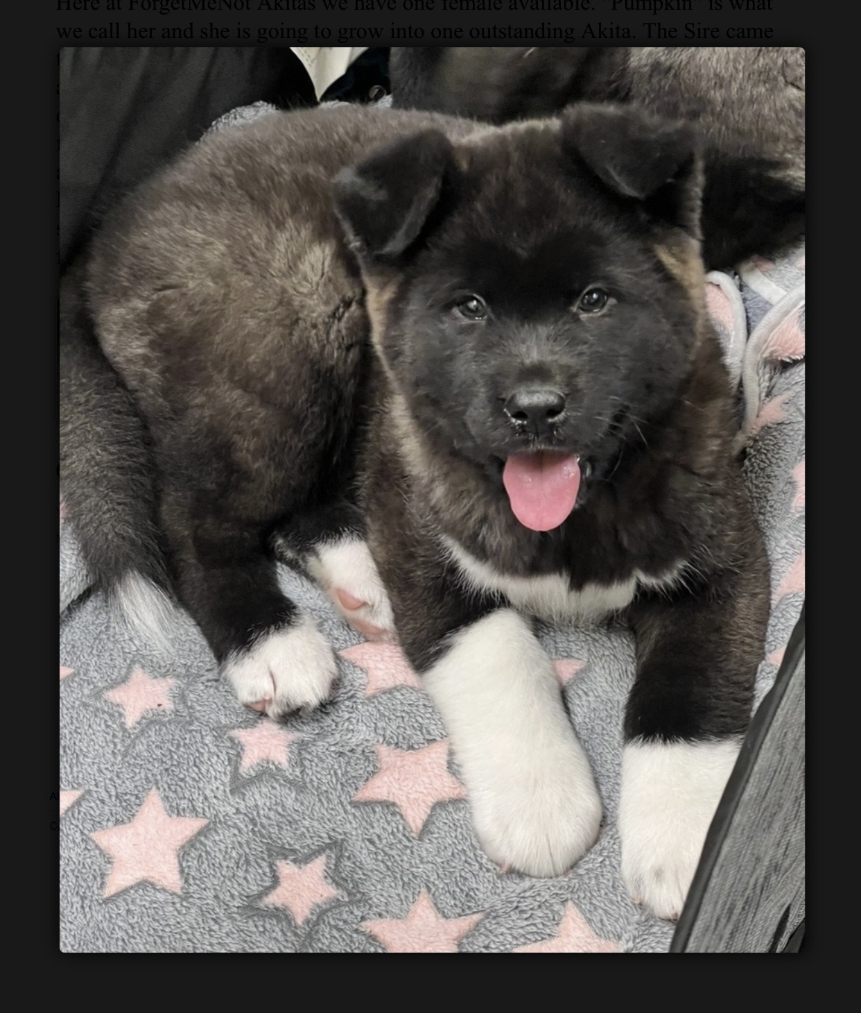 Here at Forget-Me-Not Akitas we have one female available. "Pumpkin" is what we call her and she is going to grow into one outstanding Akita. The Sire came to us all the way from Romania and has the best temperament you can ask for in an Akita. She is available now and looking for a forever home. The picture of older pups are from a previous litter. What's included. Best Friend and Protector for Life. AKC Limited Registration. (Pet Home Only). Vet Checked. Dewormed and Vaccinated. Microchipped. Introduction to the Crate. Started on potty training. Texting will get you a faster response. Please do your research on this breed. This breed is not for everyone and is on the restricted list with some landlords and housing.