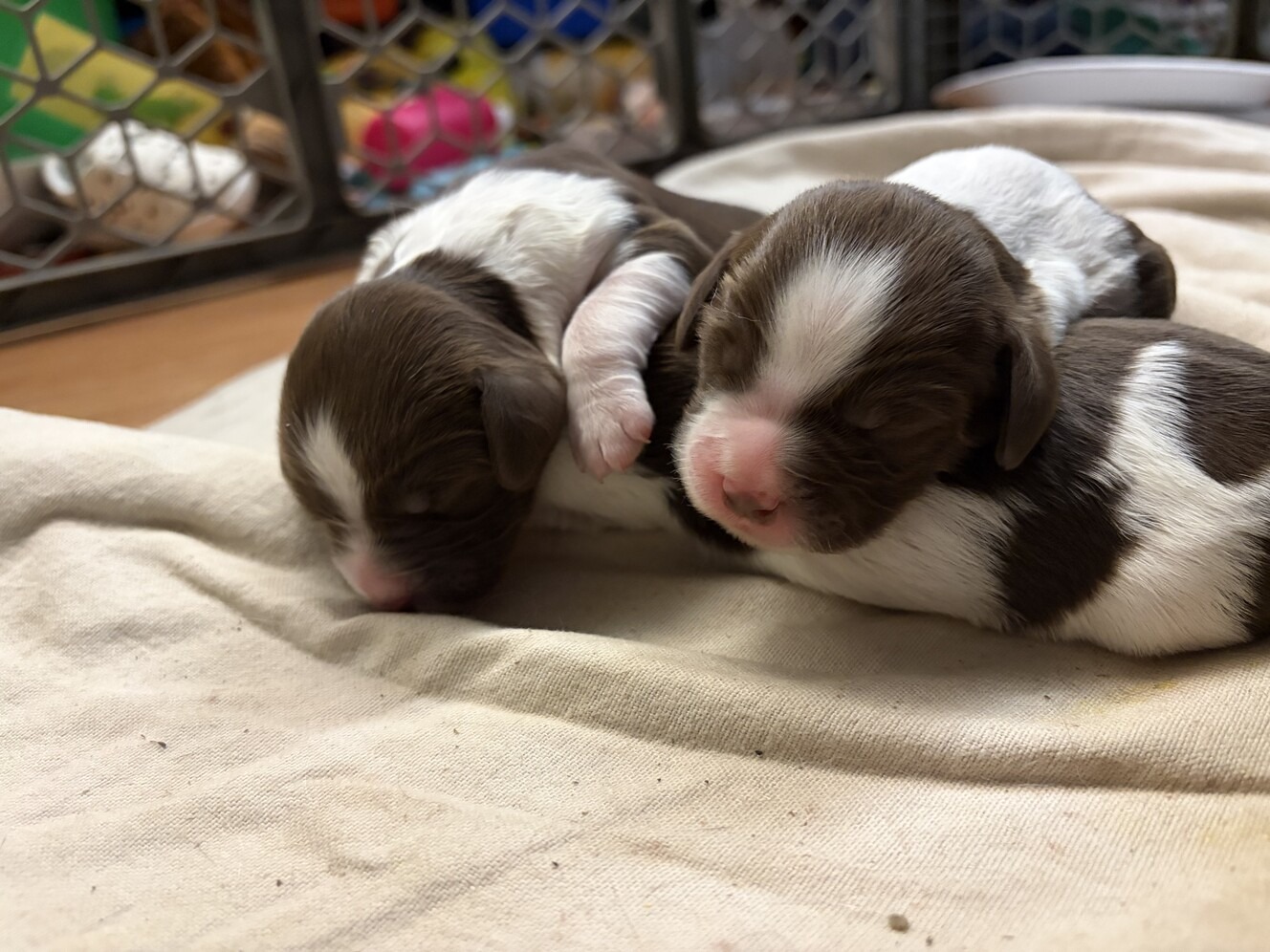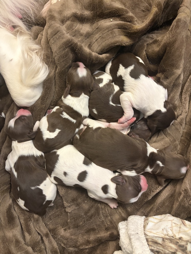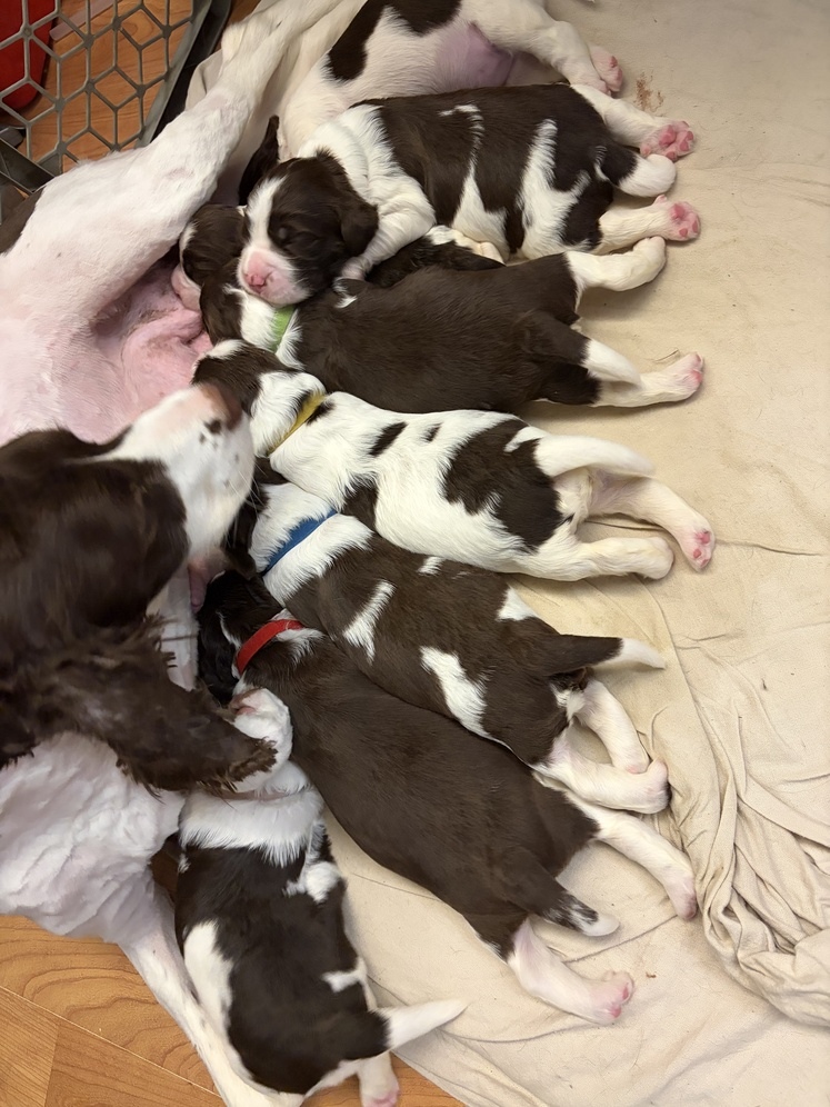 This is my third litter of springers and forth litter raised in my house. I raise my puppies in my house so they get use to all household noises. I have 5 children and the youngest just turned one so puppies are handled by kids 1-9 years old. I start potty training between 5-6 weeks old and puppies are usually potty trained by the time they go home as long as you let them out. I have a field female who is about 35lbs and a huge bench male about 90lbs. These puppies usually end up very tall and lean. Dad had papers mom does not but is genetically tested and is a pure bred. My spaniels are tail and dew claws intact and two males have back declaws.