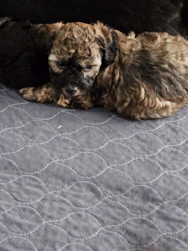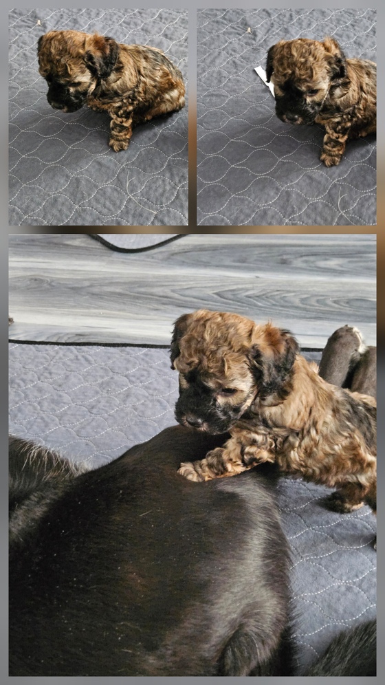 1 male toy poodle puppy left in a litter of 3, he is a confident little guy. NAPR registered comes with 1st shots, vet checked and dewormed. Ready April 27. He has a natural tail, his color is Cafe Au Late just like his dad. He is a beautiful mix of browns and tans with some black thrown in. He will look like his dad, but darker in color. His dad is AKC/NAPR registered and Mom is NAPR registered. Mom is Tan and has a sweet personality. Text message preferred. Serious inquires only, Cash or Venmo only.
