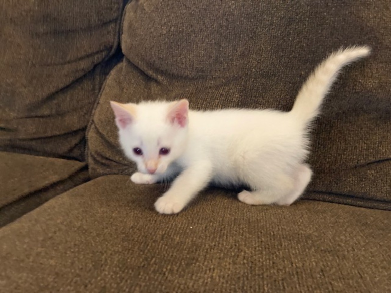 I have four adorable kittens ready to go to new homes - 2 males and 2 females. They are extremely people-friendly and playful. They are also litter box trained and are eating softened cat food (except the orange/tan one which should be ready in a few days). They are used to being around a dog. Their mom is a phenomenal mouser. They all have blue eyes.