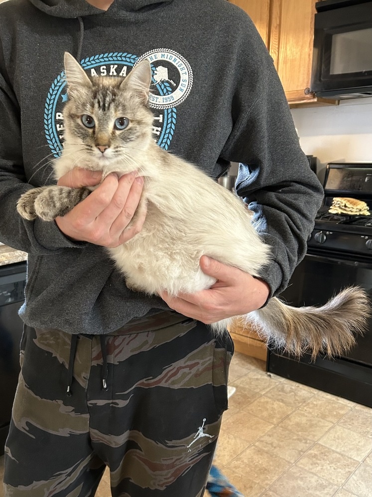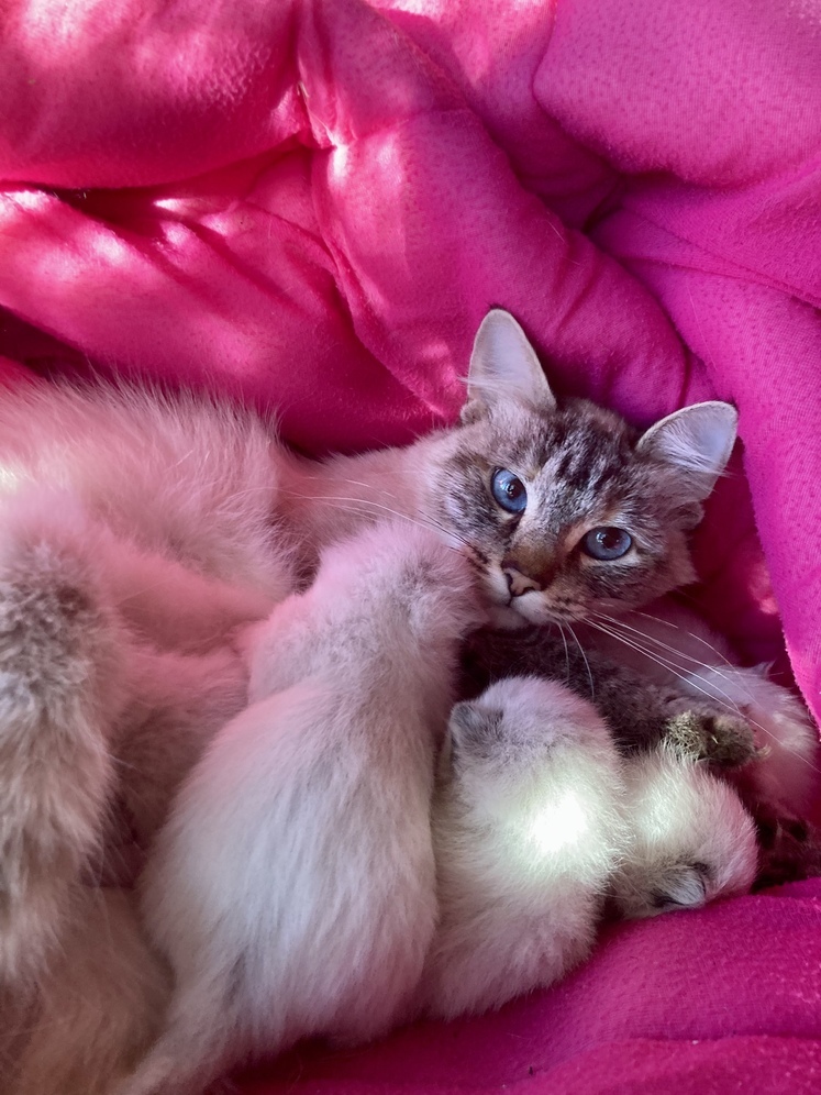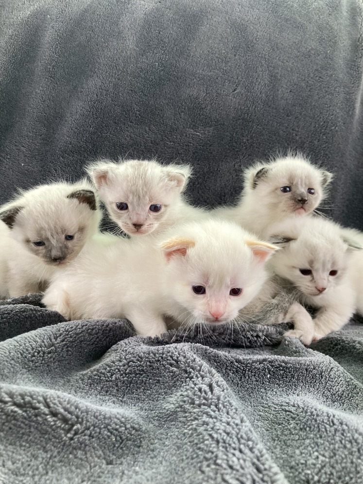 Our gorgeous family cat delivered another beautiful batch of kittens on September 22. There are 5 white kittens, all with Siamese/Himalayan-style coloring. One looks to be a flame point! It’s too early to tell gender for sure, but looks like we possibly have 3 males and 2 females. Mama Cat has been raised alongside our children, and is super chill. She’s comfortable both indoors and outdoors, and she’s a good hunter of shrews/moles. She’s very calm when held, and loves to snuggle and interact with her humans. She’s gentle as can be with our little kids. Kittens will come well personalized, and potty trained. No shots.