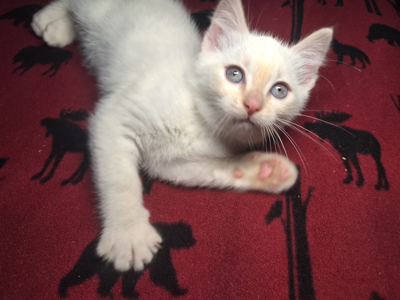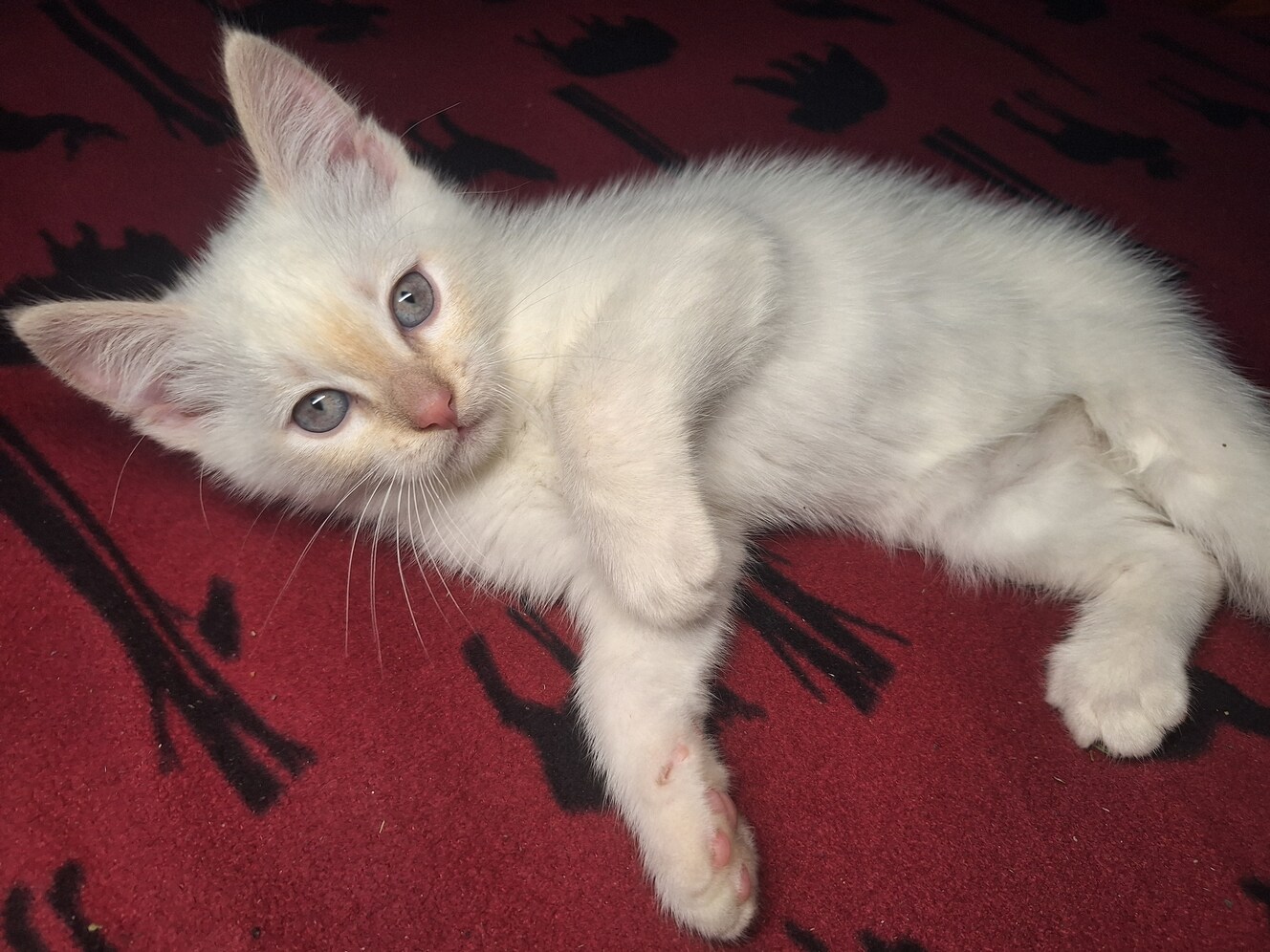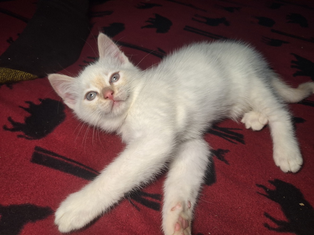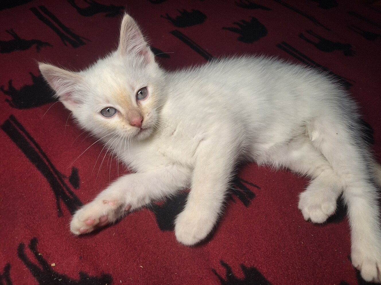 This angelic white kitten with captivating blue eyes is ready to join your family! They are sweet, playful, and already know how to use their litter box perfectly.