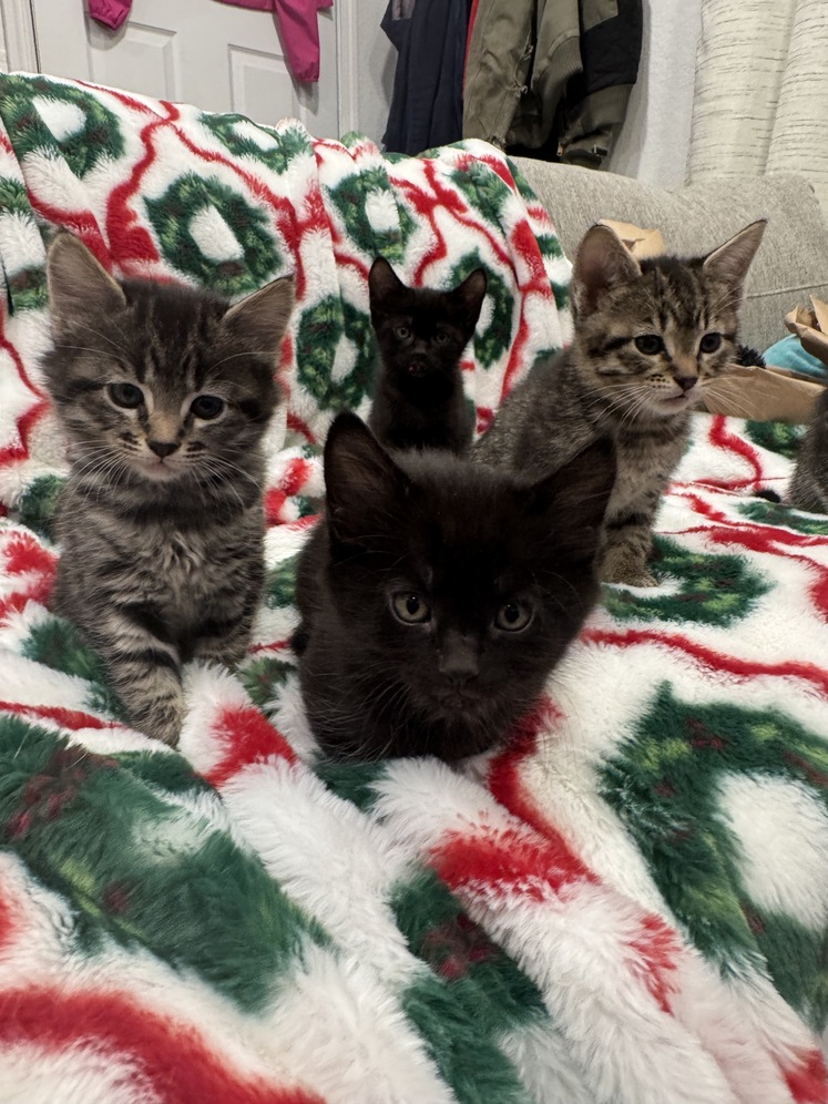 Cute Kittens. We have 4 cute kittens, one female and three males. They will be 2 months old on December 26th. Litter trained, eat regular cat food. They are very energetic and fun to play with.