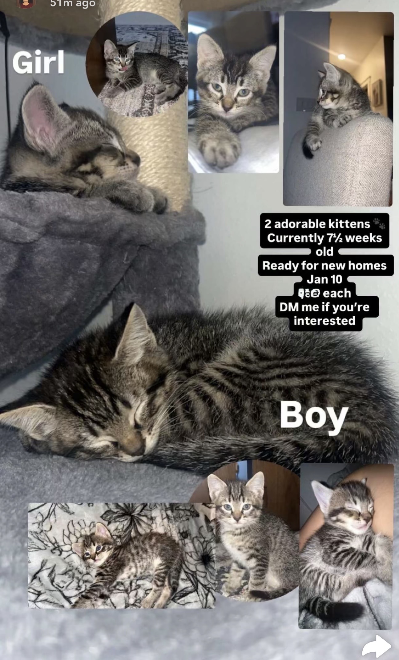 2 available kittens. 1 boy and 1 girl $100 each Mom cat is also available, friendly (free)