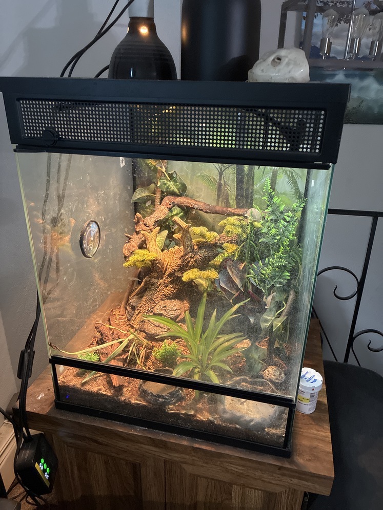 24X18 Terrarium with Brown Anole . I have a tank that is 24x18 hiding a brown anole at this time. Both need new homes. Tank is really nice with misting system and lights, extra bedding terrain and plastic plants. Has two spider plants inside terranium