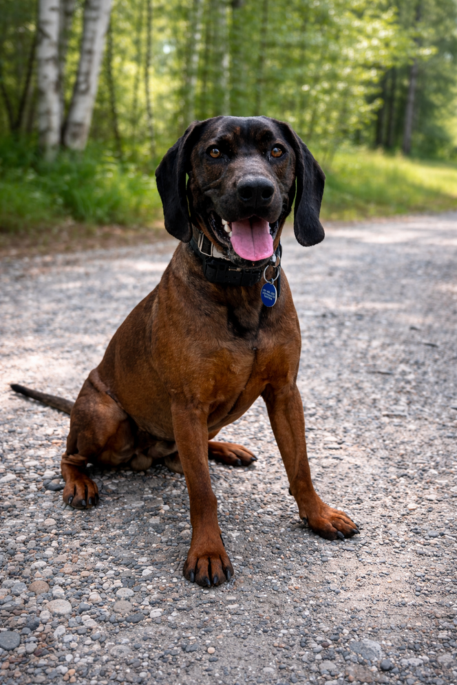 While this dog is family-raised and not currently an active working hound, his parents and grandparents were proven working Bavarian Mountain Scent Hounds, bred for the traits this breed is known for.