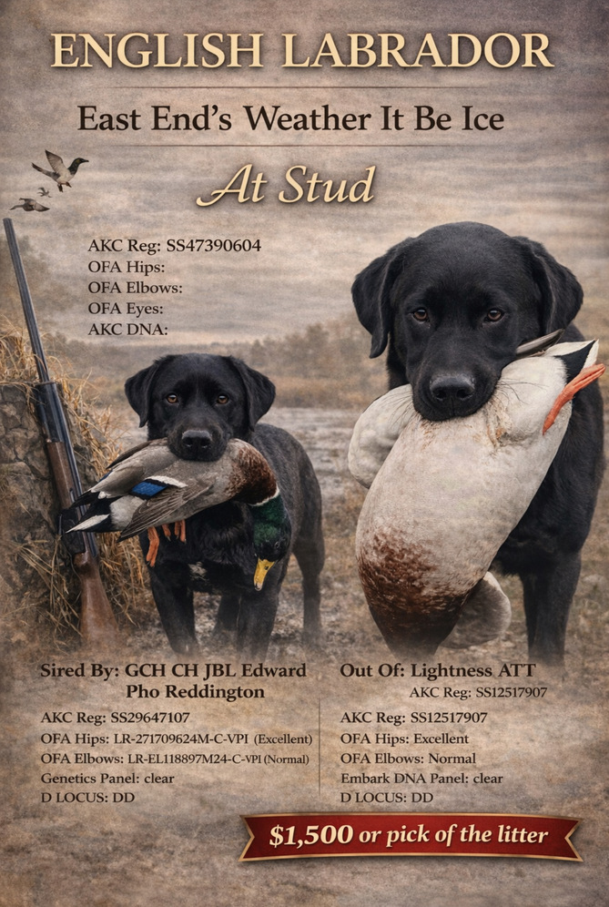 Sired by a grand champion show dog, out of one of my last breedings with my English female Lab. Ace is a beautiful English/ blocky Lab that has a pedigree just as gorgeous. His structure is there along with hunting abilities as well. Ace has duck hunted in Idaho with me as a younger dog (under 6 months) he did fabulous and was a natural. Genetic testing pending through AKC His parents are clear through embark, and paw print genetics. OFA Hips and elbows scheduled at end of March. Eyes tested and were clear but not submitted to OFA yet. (proof of results available upon request) If you are interested in using this beautiful boy to sire a future litter please give me a call or text. I’d be very happy to answer all questions. Thank you.