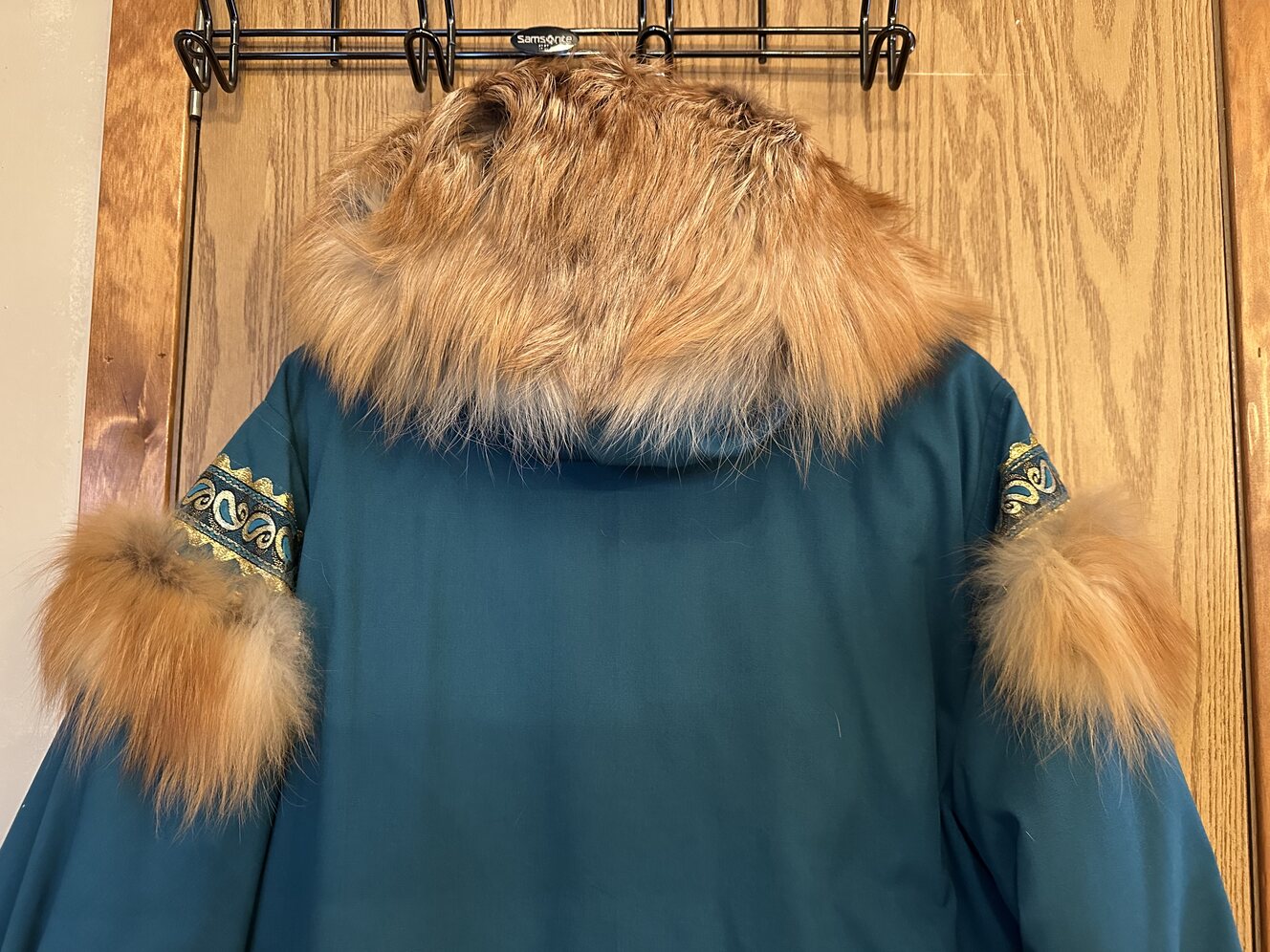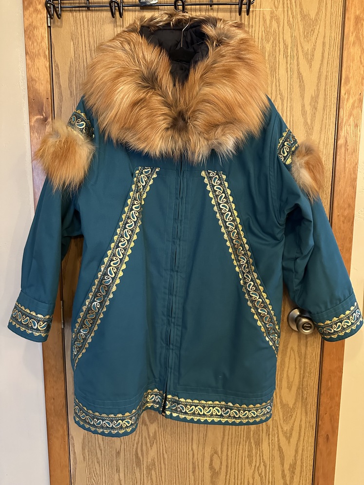 This is a Red Fox trimmed Laura Wright Alaskan Parka. Trimmed around hood and shoulders. Super warm, just beautiful. Truly an Alaskan tradition. Teal color with gold Rick rack. Size L-XL