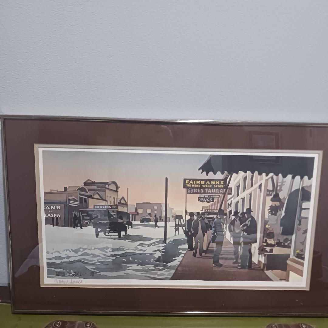 Byron Birdsall signed and numbered print of Fairbanks. 1981.63/500. Double matted and framed. In excellent condition. Overall size 16"x27". Will deliver Anchorage or the Valley. $95.00. Call or text: 907-441-1643