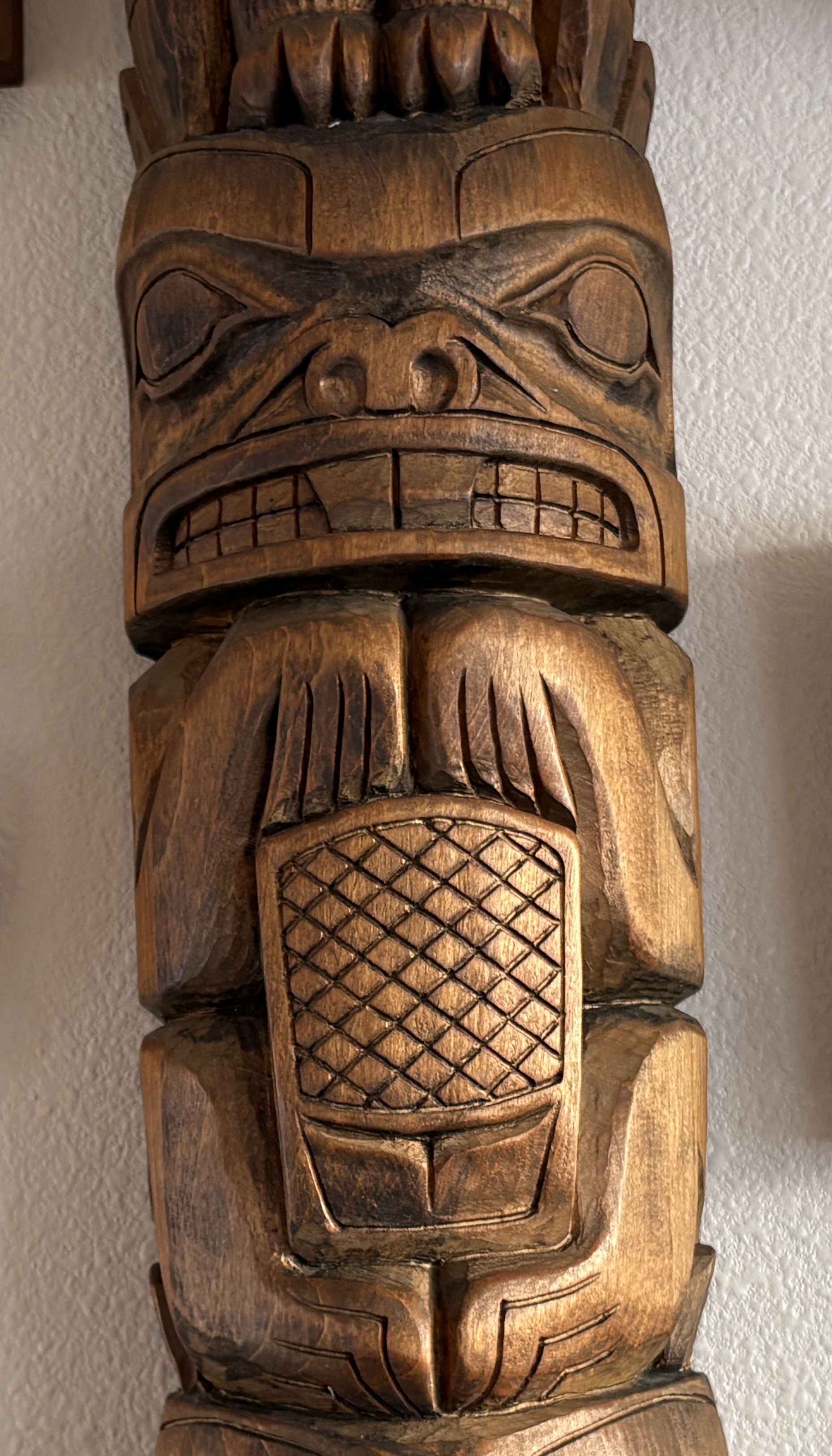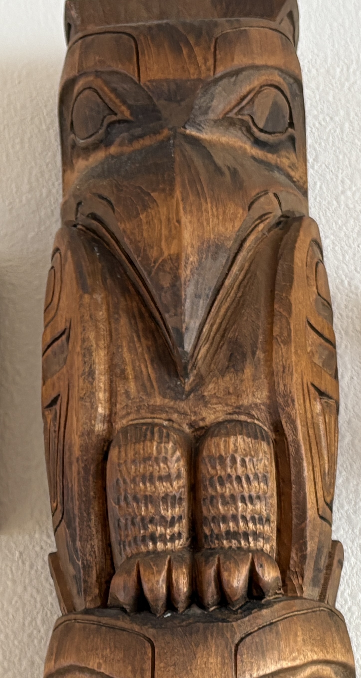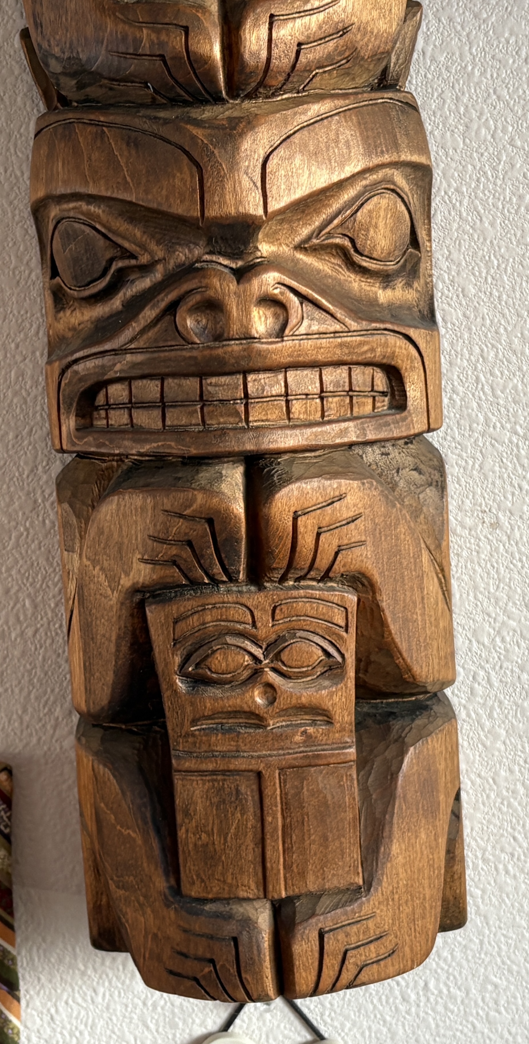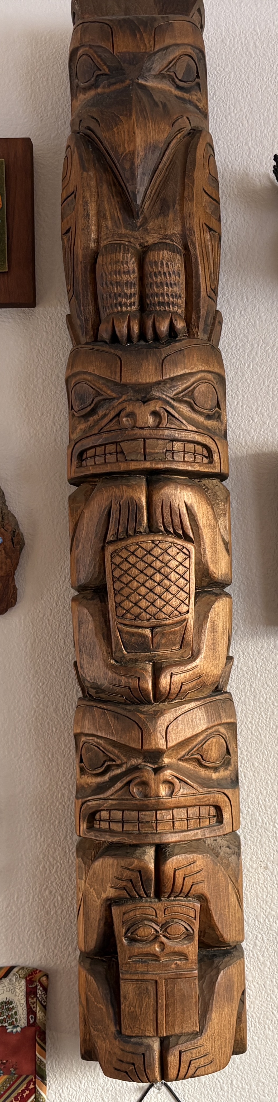 Totem, crafted in Juneau in early 1970s with hand-carved finishing. All wood. Easily hangs on a wall (attachment included). Three feet tall, 5 1/2" wide, 4 1/2" deep. Features raven, Beaver, and Bear carvings. Great conversation piece, unique wall hanging, perfect special gift.