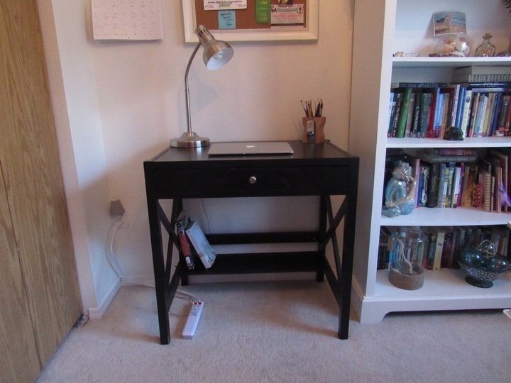 Black solid wood desk with extra space in the form of a large drawer and shelving underneath for books or trinkets. It is in perfect condition with the exception of a few scuffs here and there.