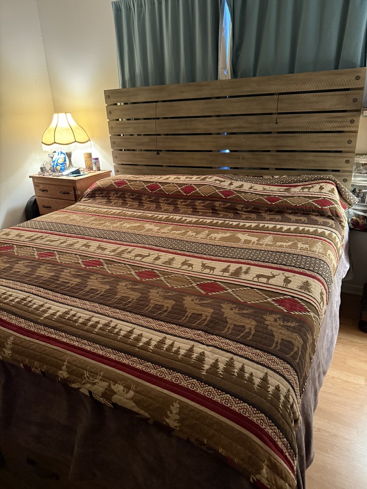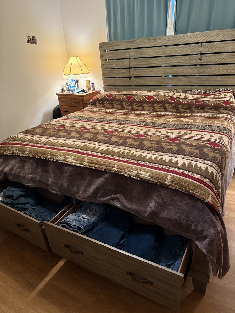 California King Memory. The bed frame has two drawers at the foot board and a tall-ish headboard. Mattress is memory foam. All in working form. I do not need this large bed anymore. You can also take the sheets and a couple comforters as well, if you’d like…. Bring your own pillows! Please do not call or text after 8pm or before 8am.