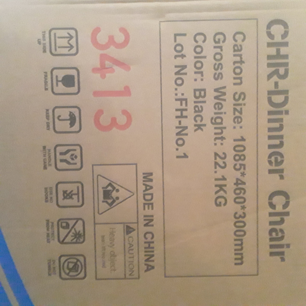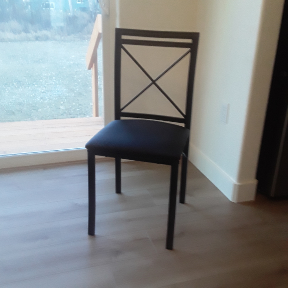 4new dinner chairs, black with black upholstered cushions. 1 assembled, 3 in box. Back 35" tall, seat cushion 15 1/2" X 15 1/2", seat height 18 1/2". Powder coated black metal, possible delivery.