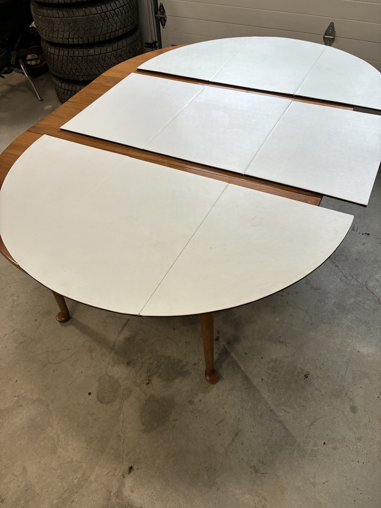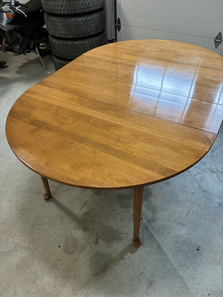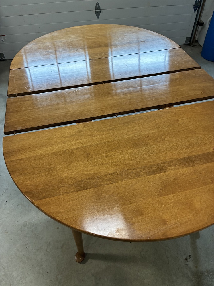 Beautiful solid maple,(I think), dinner table with three expansion leafs and pads. Excellent condition no scratches or dings.