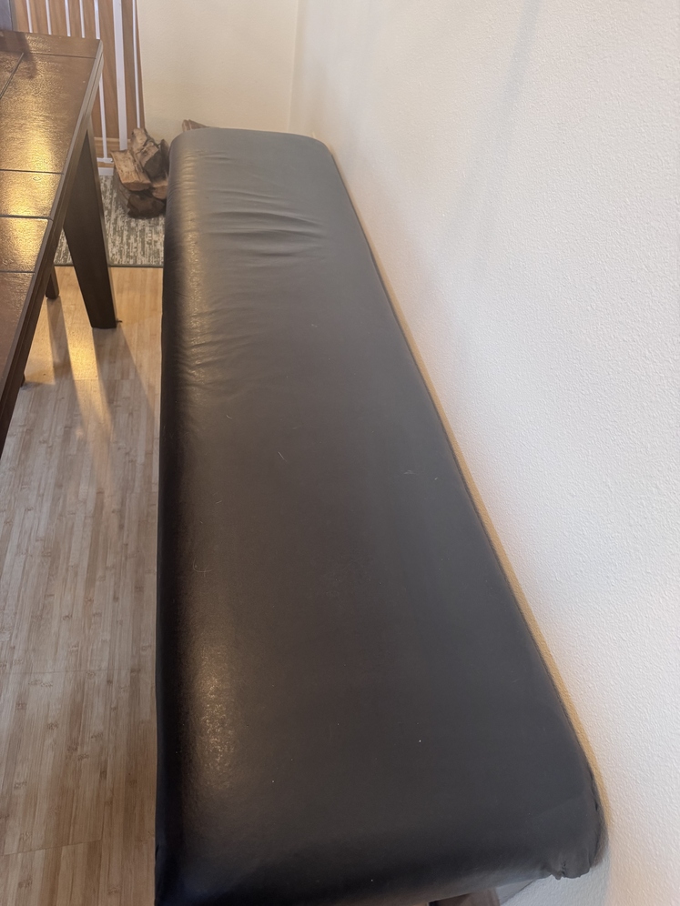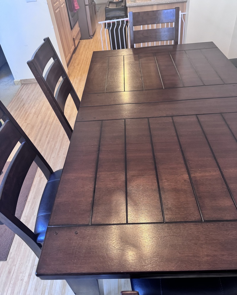 Large family dining room table in wonderful condition. 6’ x 3 1/2’ with a one and a half foot extender. Has four leather chairs and one newly reupholstered leather bench