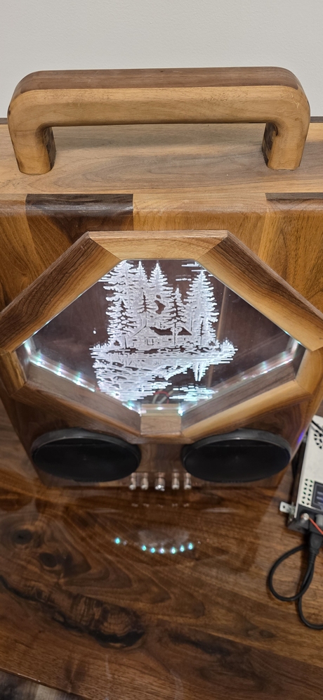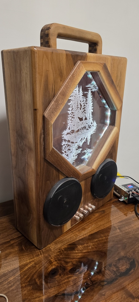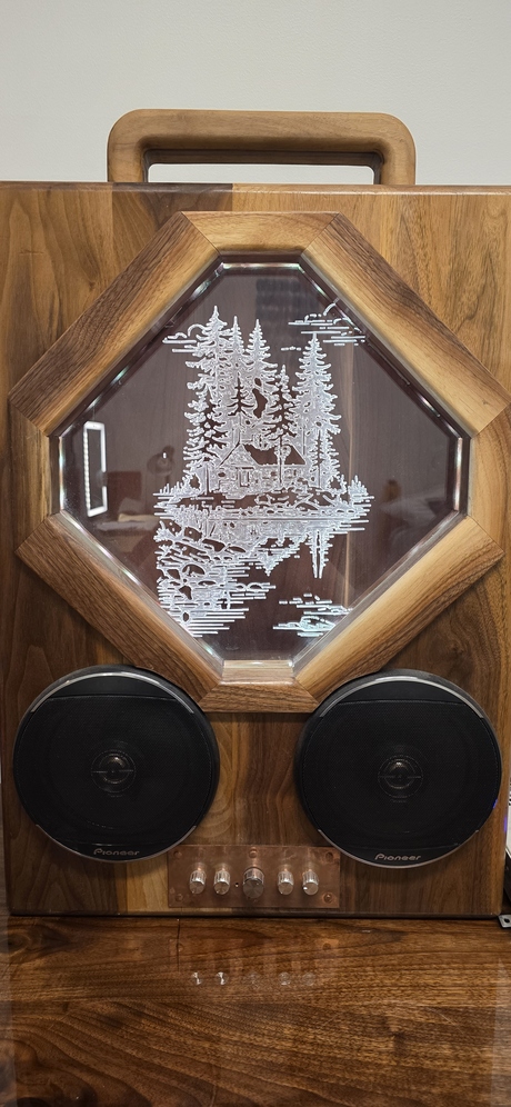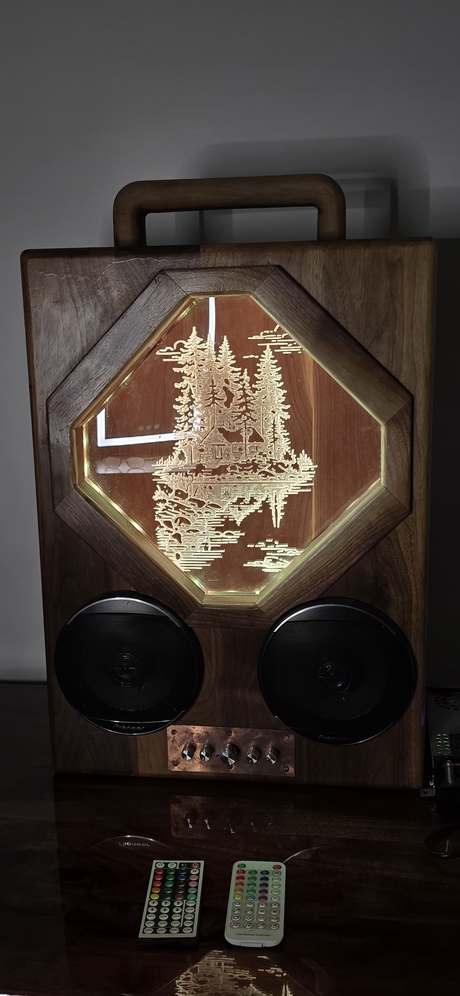 Dm me for more information, I made this system last year, its made of walnut and copper front and back plates, Bluetooth connection. Comes with hand made sub as well, and power cord. saving money for a rifle. 1 of 1 i also have a video of how it sounds so just ask!
