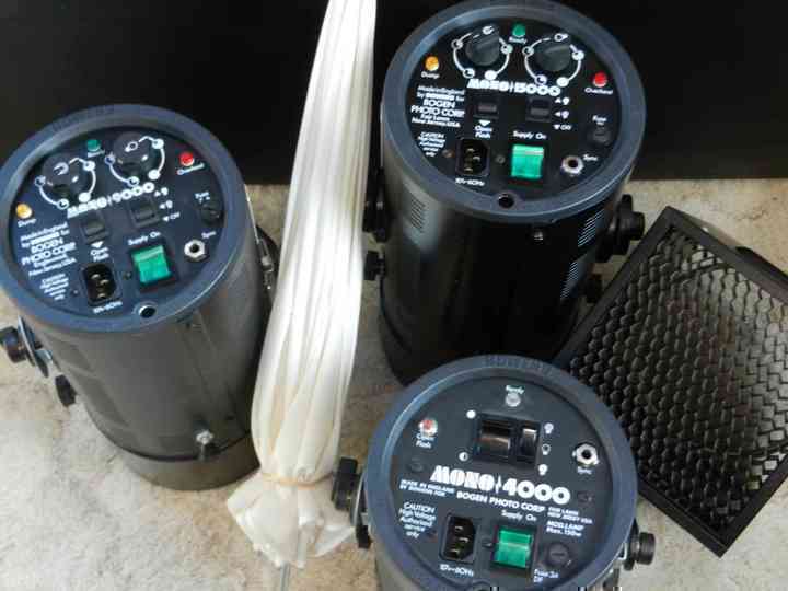 Full studio setup. Bogen Bowens mono 15,000 studio lighting kit w/case. Includes 3 monolights (15,000; 9,000; 4,000), stands, umbrellas, & honeycomb grid. Reflectasol w/bracket. Two Morris PG-3200 flash backlights w/barn doors, gel filter pack and stands. Separate Photoflex softbox to use with monolight. Gossen light meter. Slaves, cords, and extra stuff. Everything in excellent condition. Older reliable Bowens technology perfect for starting a studio. $950 OBO.