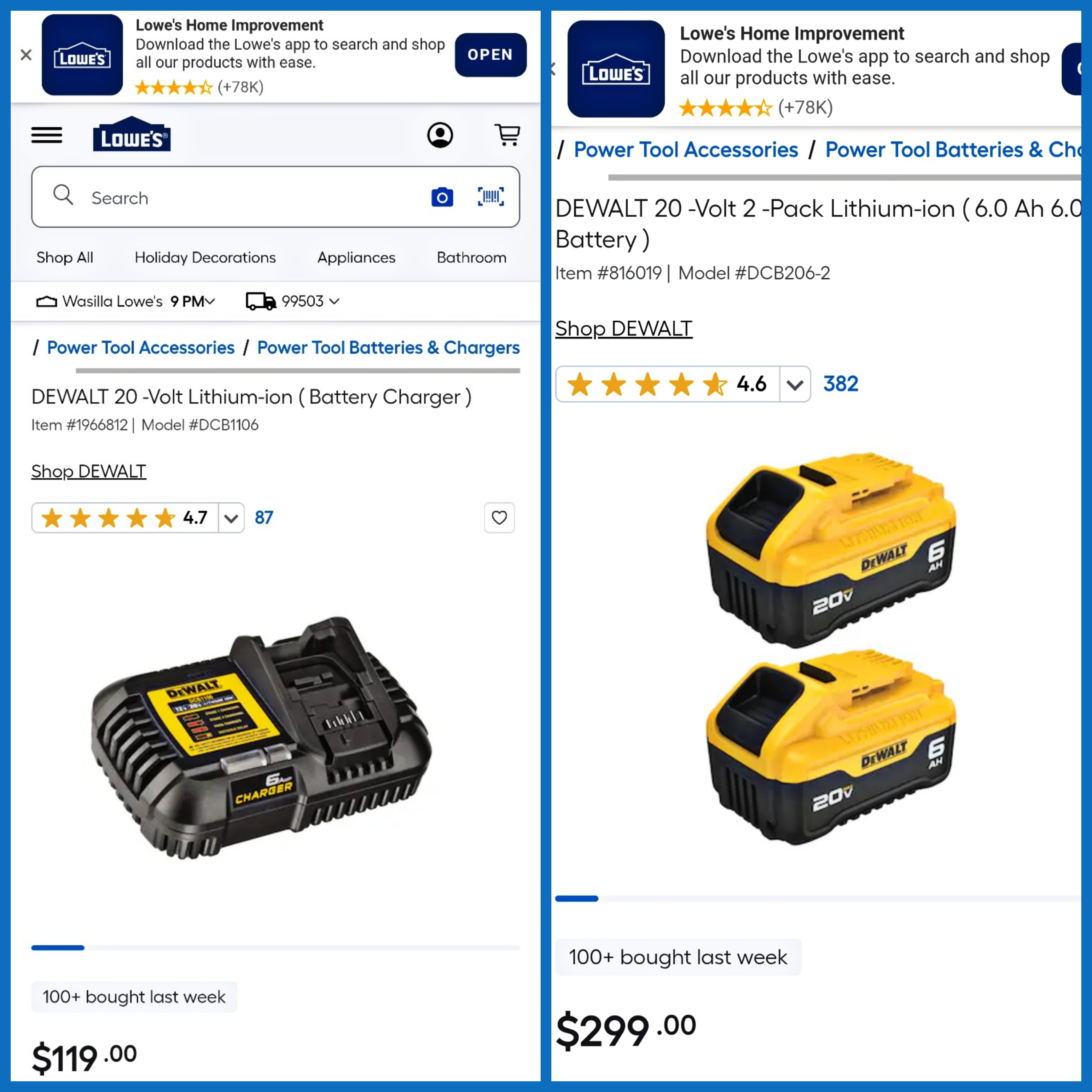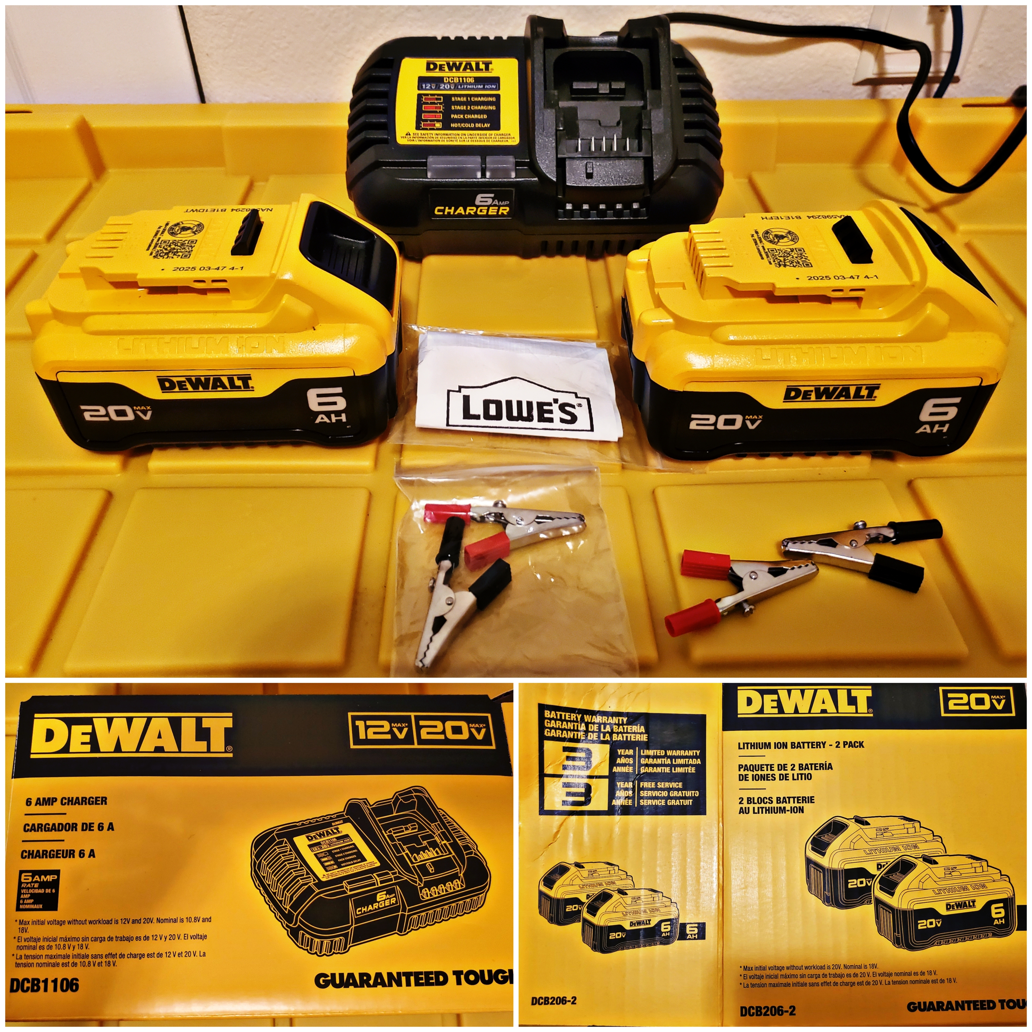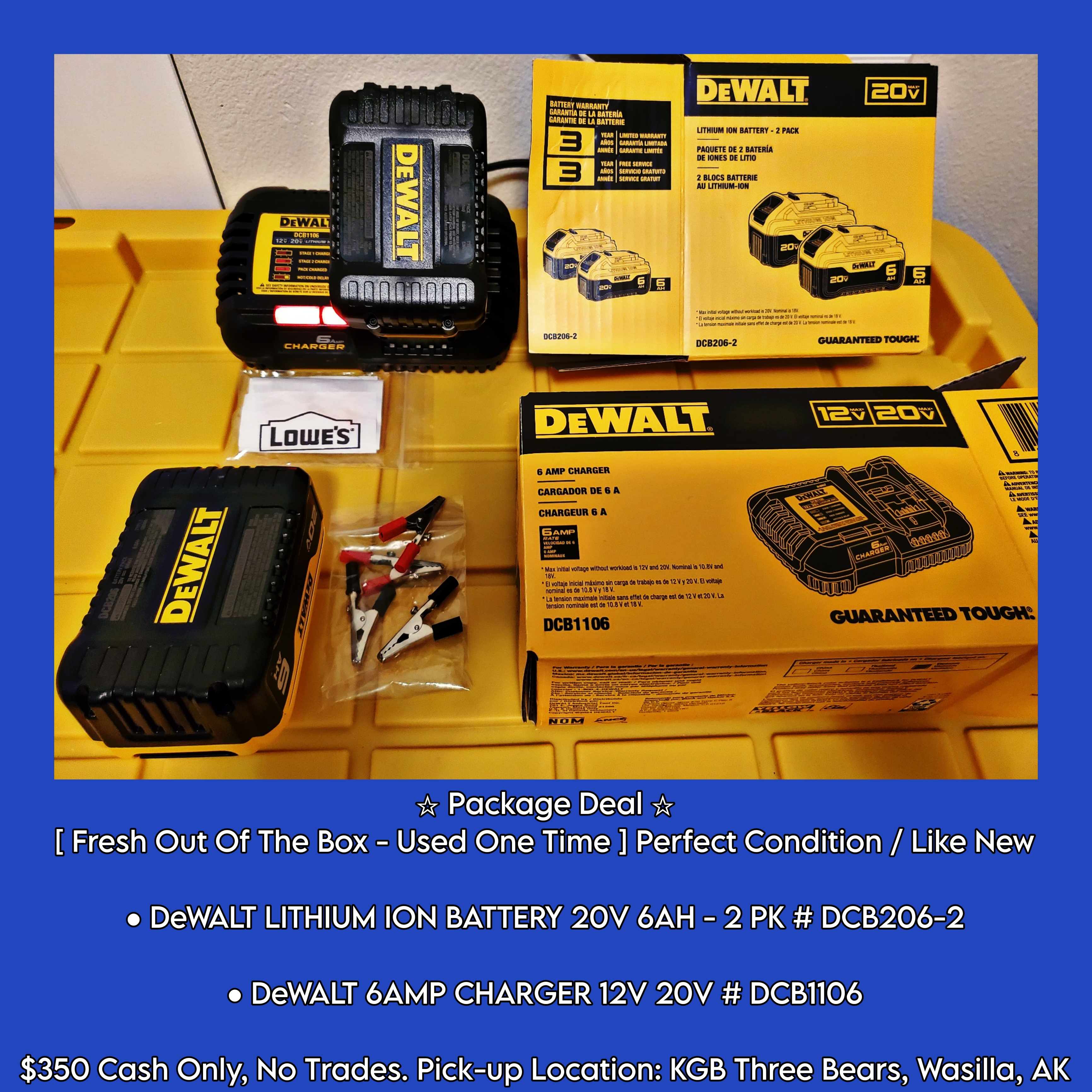 Package Deal. Fresh Out Of The Box Used One Time. Perfect Condition / Like New. DeWALT LITHIUM ION BATTERY 20V 6AH 2 PK. # DCB2062 DeWALT 6AMP CHARGER 12V 20V. # DCB1106. $350 Cash Only. No Trades. Pickup Location. KGB Three Bears. Wasilla. AK. Tags. Power Tools. Construction. Cordless. Drills. Impacts. Saws