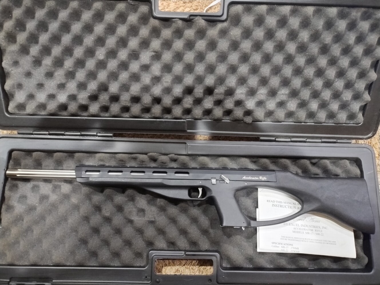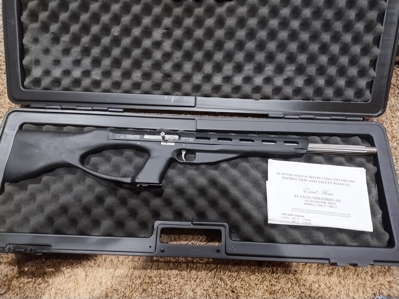 Excel arms MR17 accelerator rifle. Chambered in.17 HMR. Has 18 inch fluted bull barrel Has one 9 round magazine. Original owners manual. Padded carry case. It has only been factory fired and is in pristine condition. If interested please call 9078419333