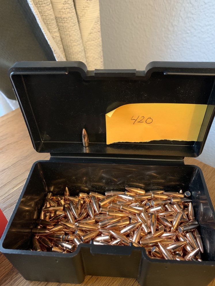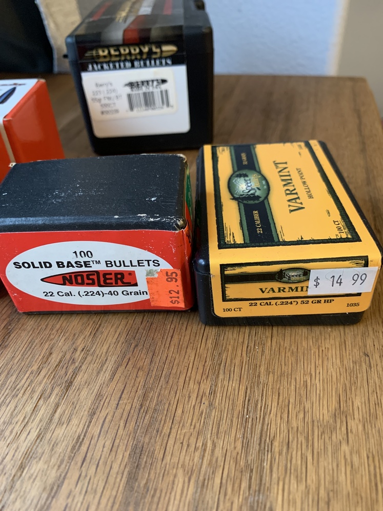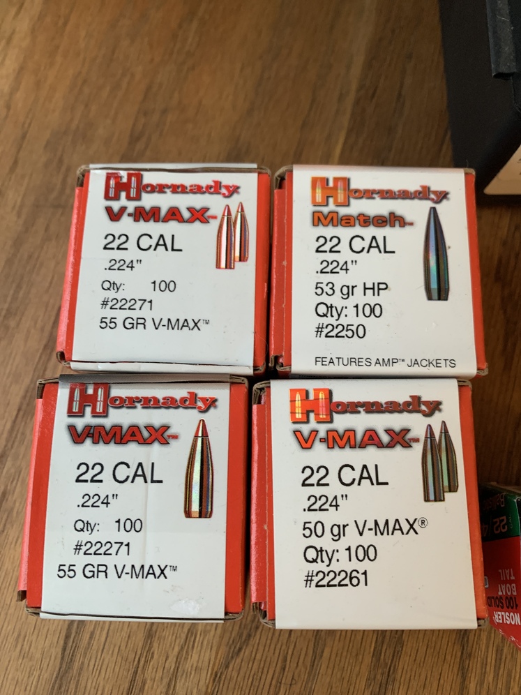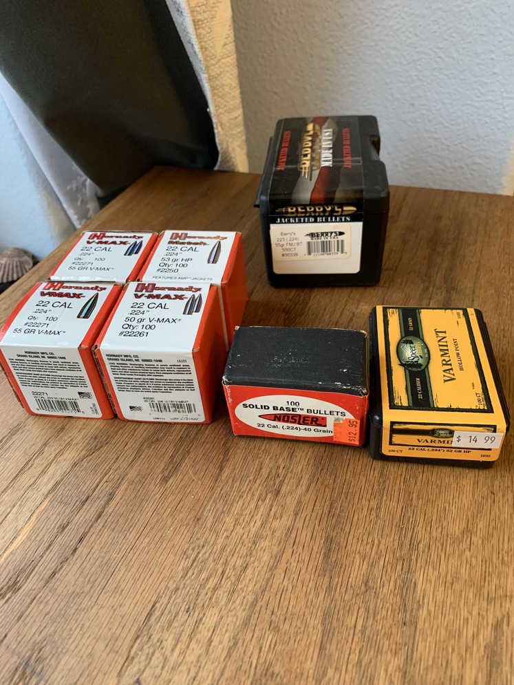 Reloading bullets for .224 Seven boxes of bullets, including 4, 53 and 55 grain 100 count Hornday bullets. One box of spear bullets, one box of Nosler bullets, and an open box of Berry’s Bullets. That box has about 420 bullets.