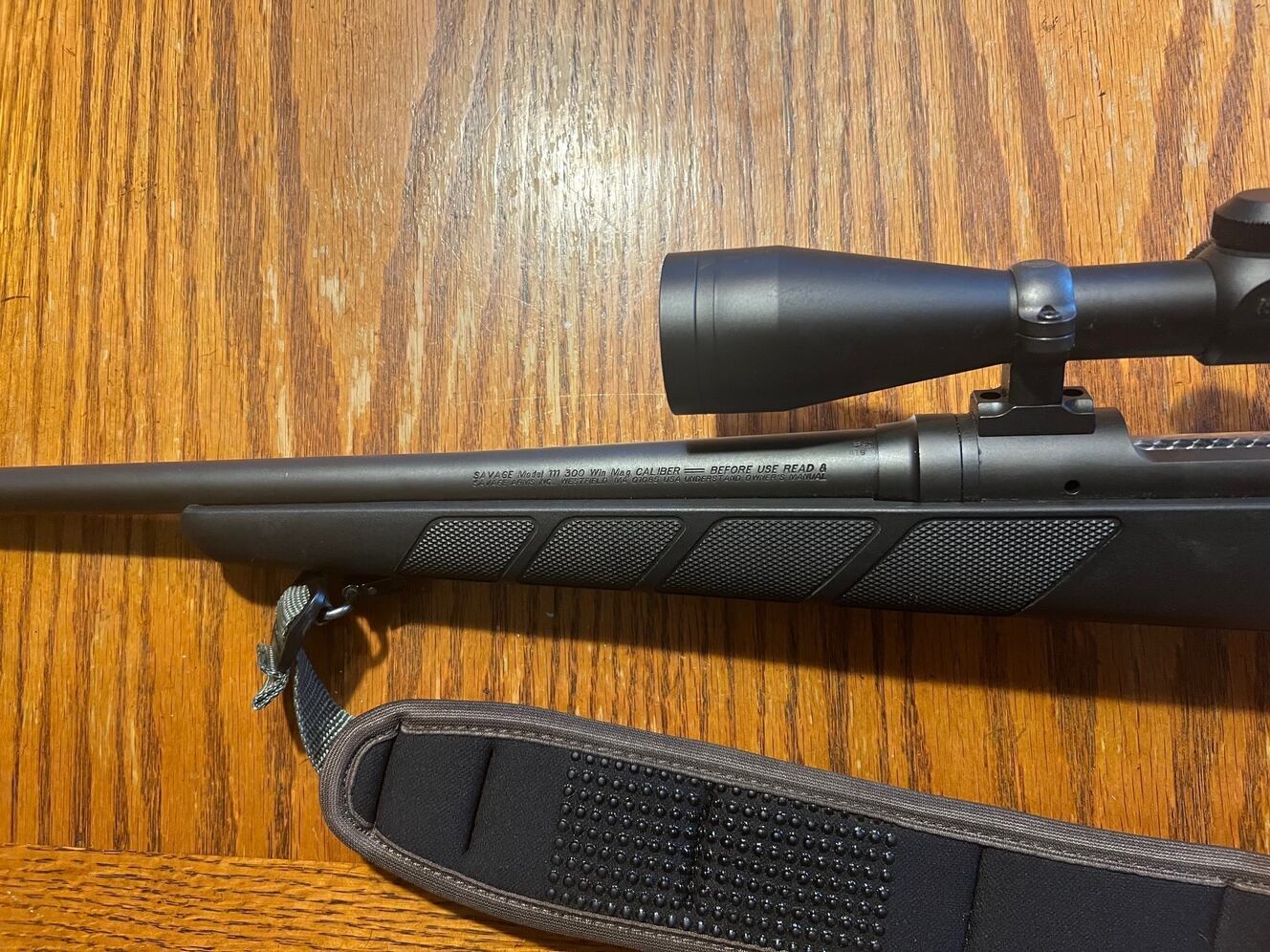 Savage 111 in .300 win mag w/ Nikon 3-9x40mm BDC scope. Great rifle, just downsizing. Less than 50 rounds through it.
