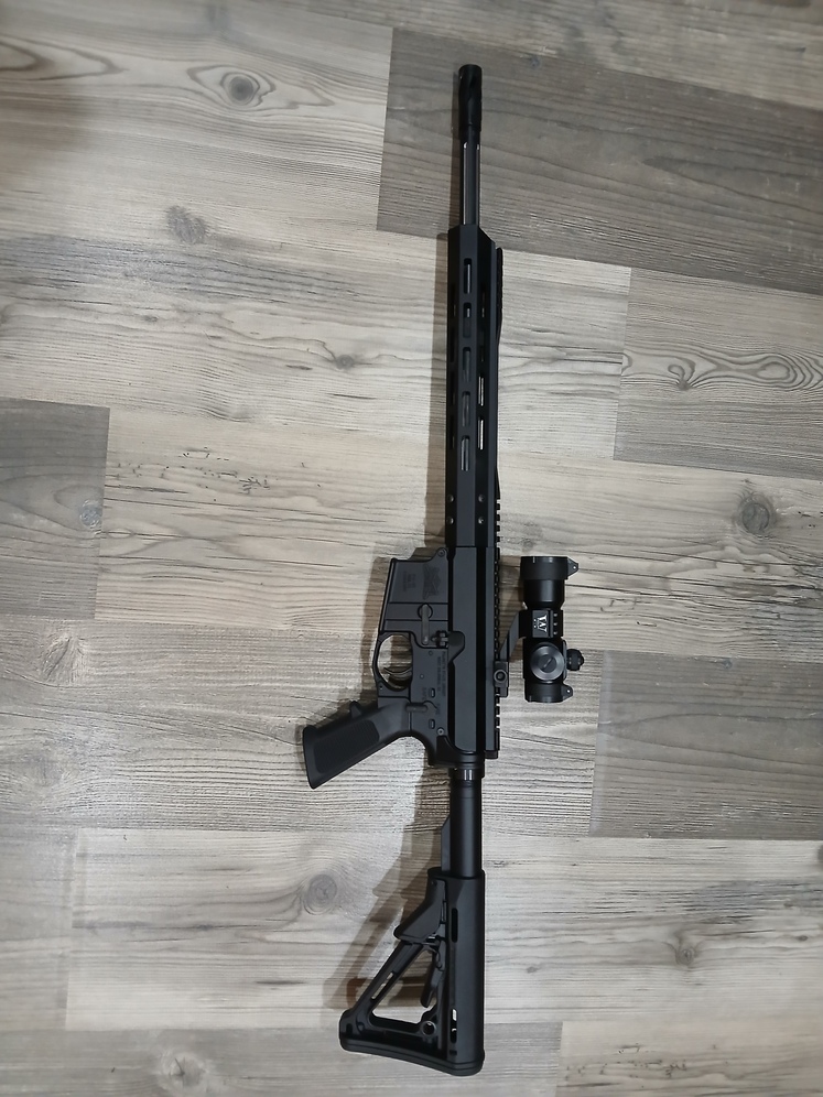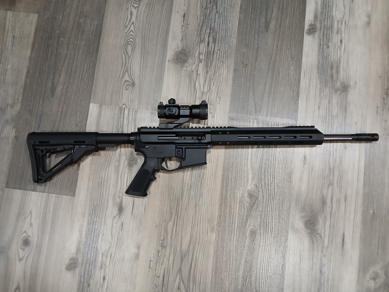 16 inch black stainless steel fluted barrel. Side charger with red dot optic. Will be driving through wasilla and anchorage October 7th