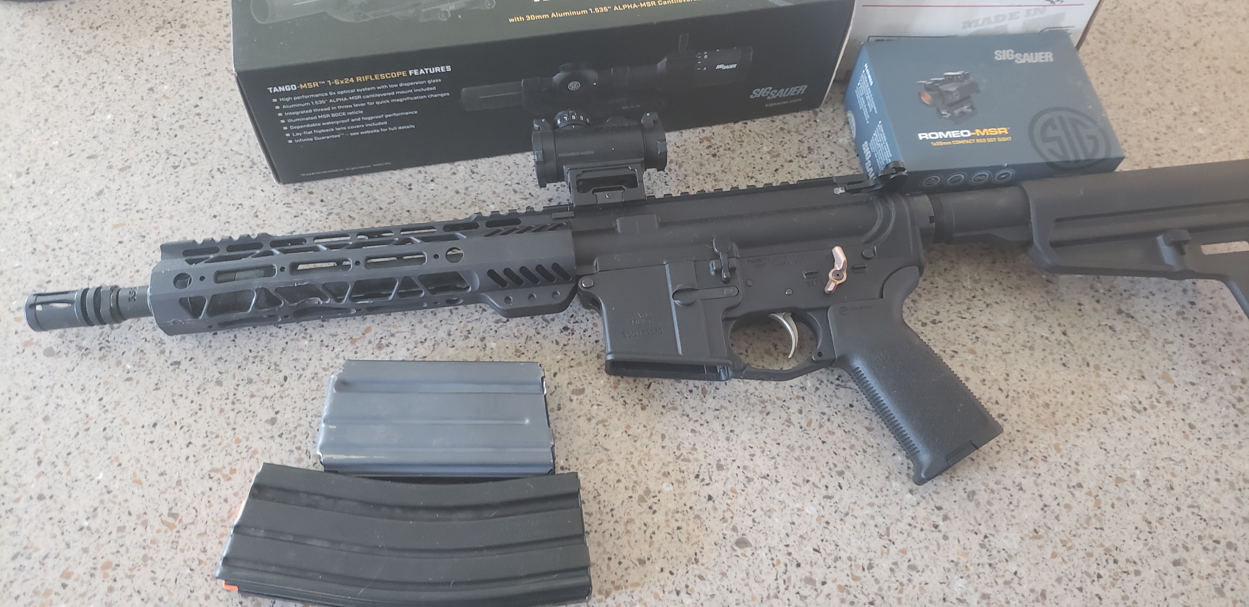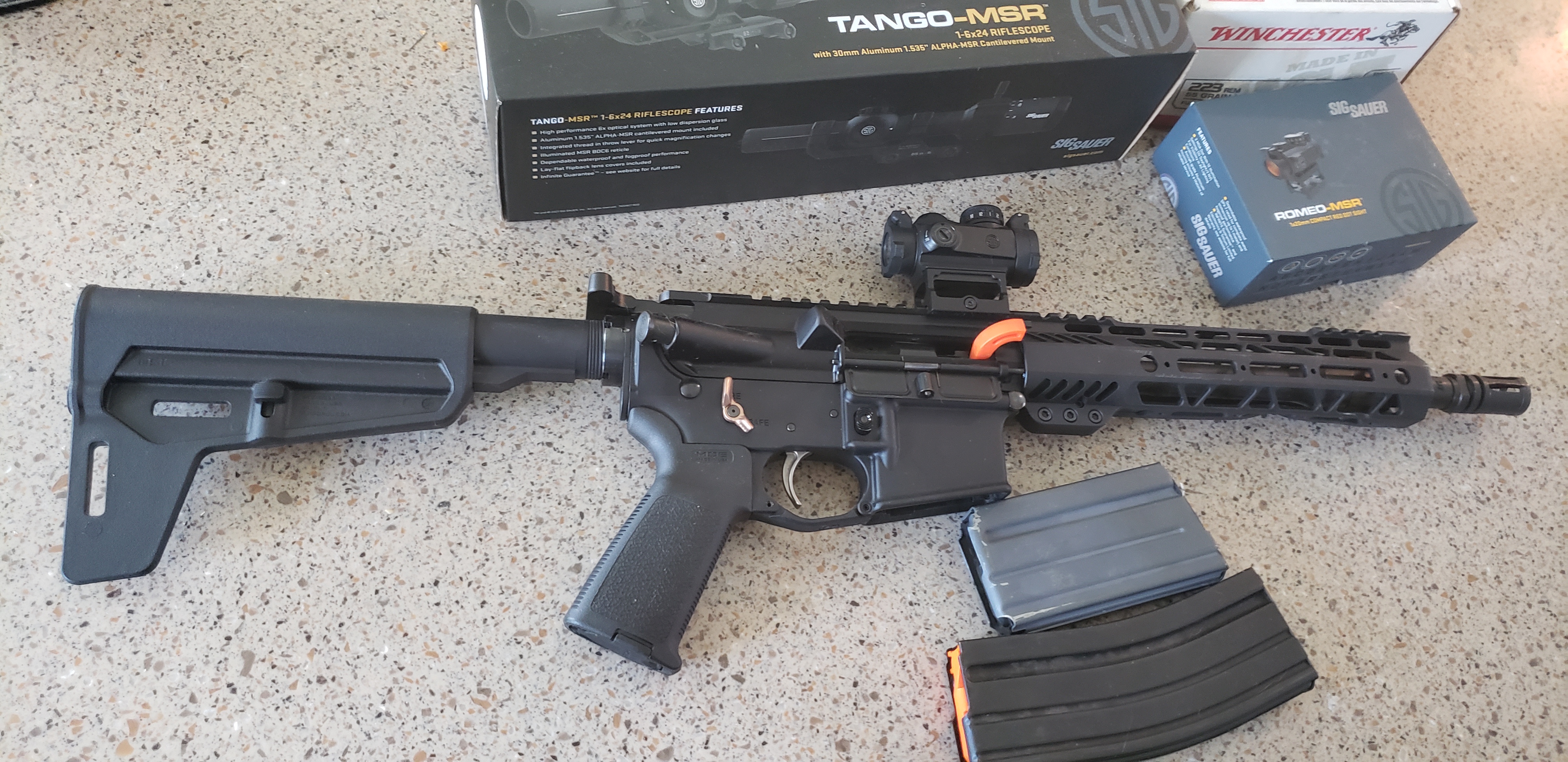 Palmetto State Armory Ar pistol chambered in 5.56 with a 10.5 barrel for sale. Comes with an msr red dot and a 1-6 lvpo and two magazines and 300 rounds of .223. Hand guard has a dent but shoots fine and a replacement from psa is 80$. Asking 650$ obo.