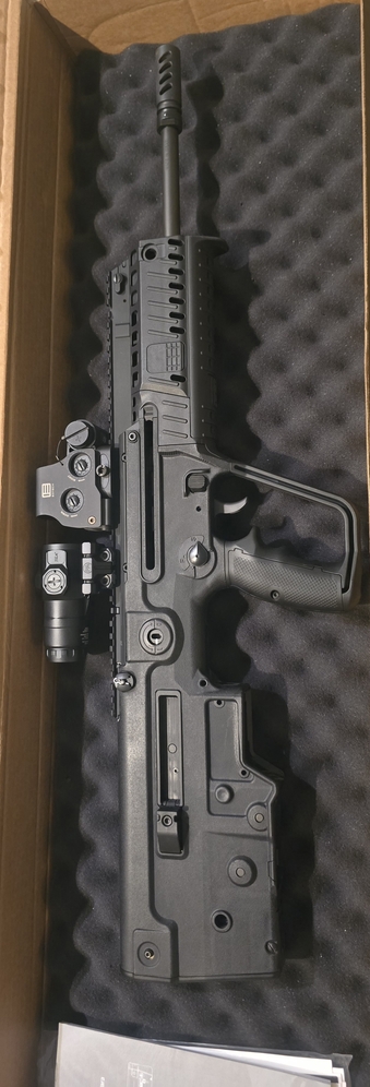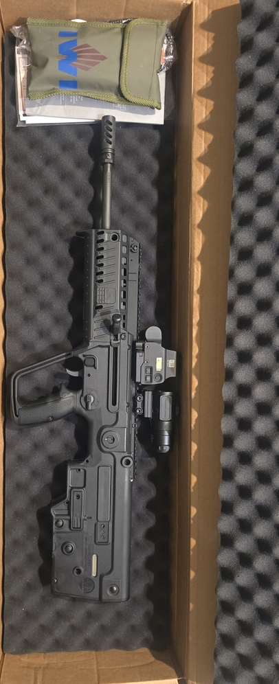 Tavor X95 chambered in 5.56 with an Eotech exps3-4, a Primary Arms 3x magnifier, and a thin butt plate. Have put around 500 rounds through it and its rock solid.