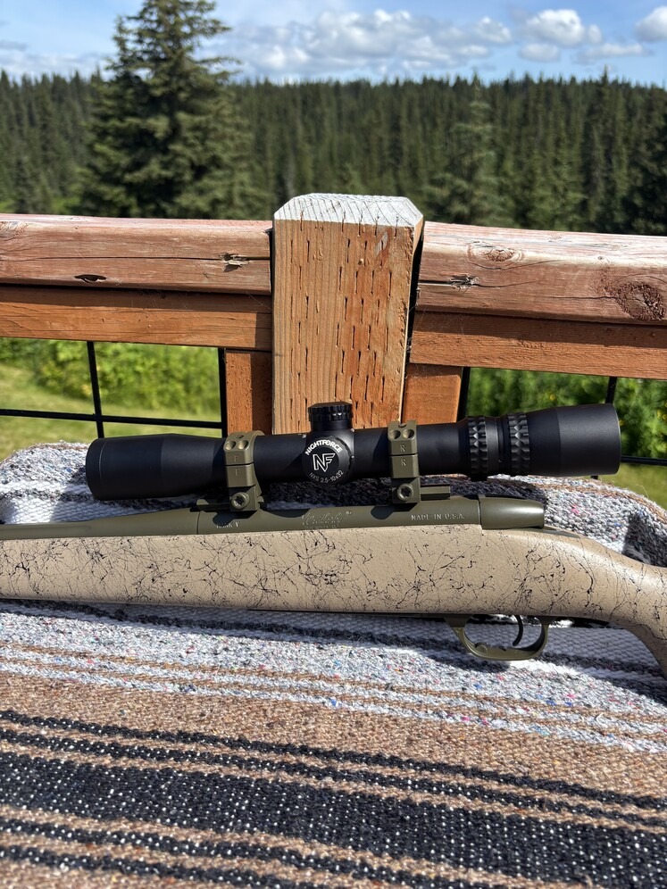 Wetherby Mark V ultra light with NightForce NXS 2.5-10x32. Illuminated Velocity 600 Reticle. Stainless action and barrel cerakoated OD green. Ken Farrel rings and pic bases also cerakoated. Chambered in .308. 7lbs 3 ounces as pictured.