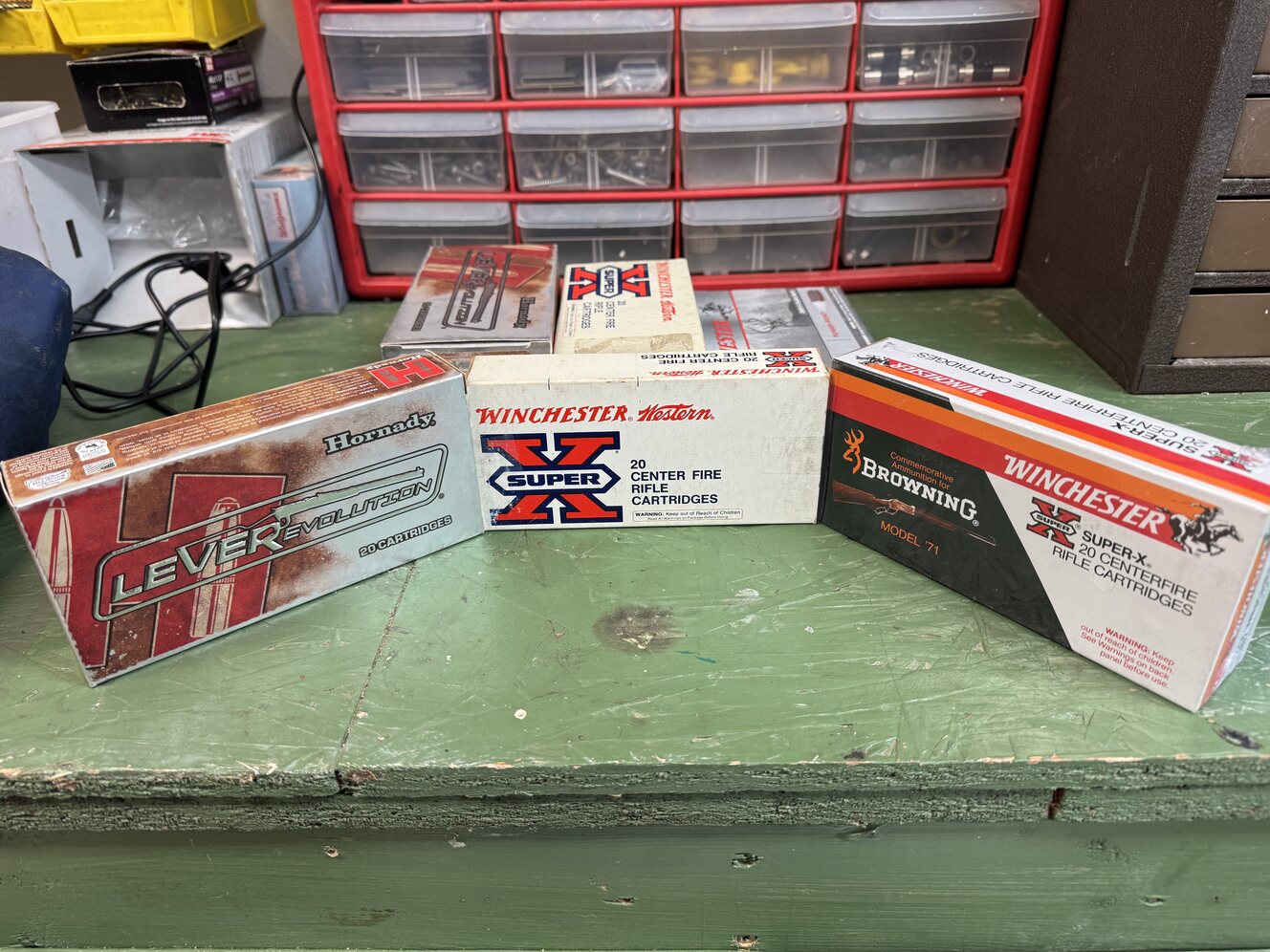 Full boxes of .348 factory ammunition. All boxes are loaded with 200 gr bullets. Both Winchester Silvertip bullets ($120 per box) and Hornady Leverevolution FTX bullets ($100 per box).