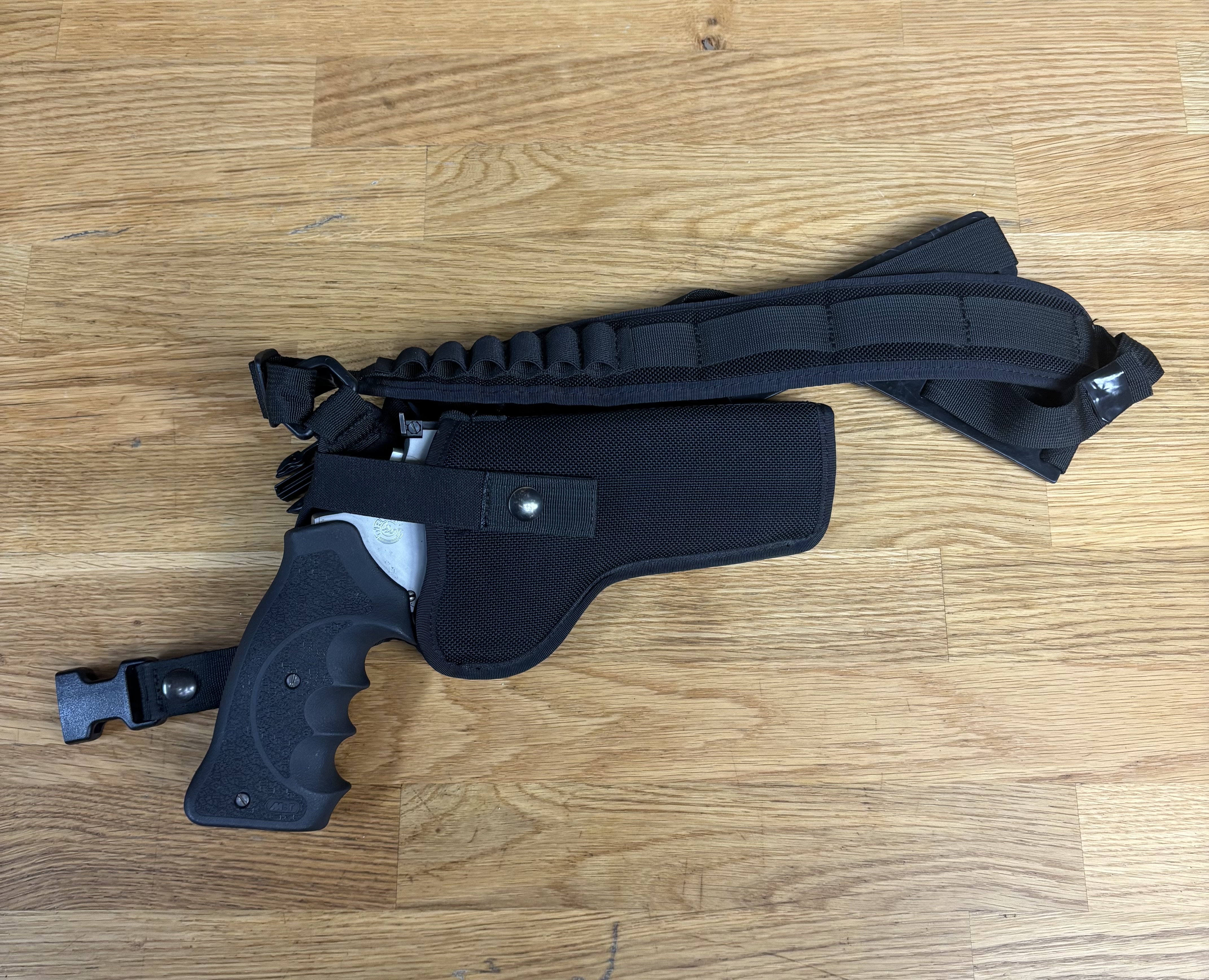 5” barrel. Diamond-D chest holster. Upgraded target style nylon grip. Decent shape. Comes with factory grip also. Trades welcome. Text is best