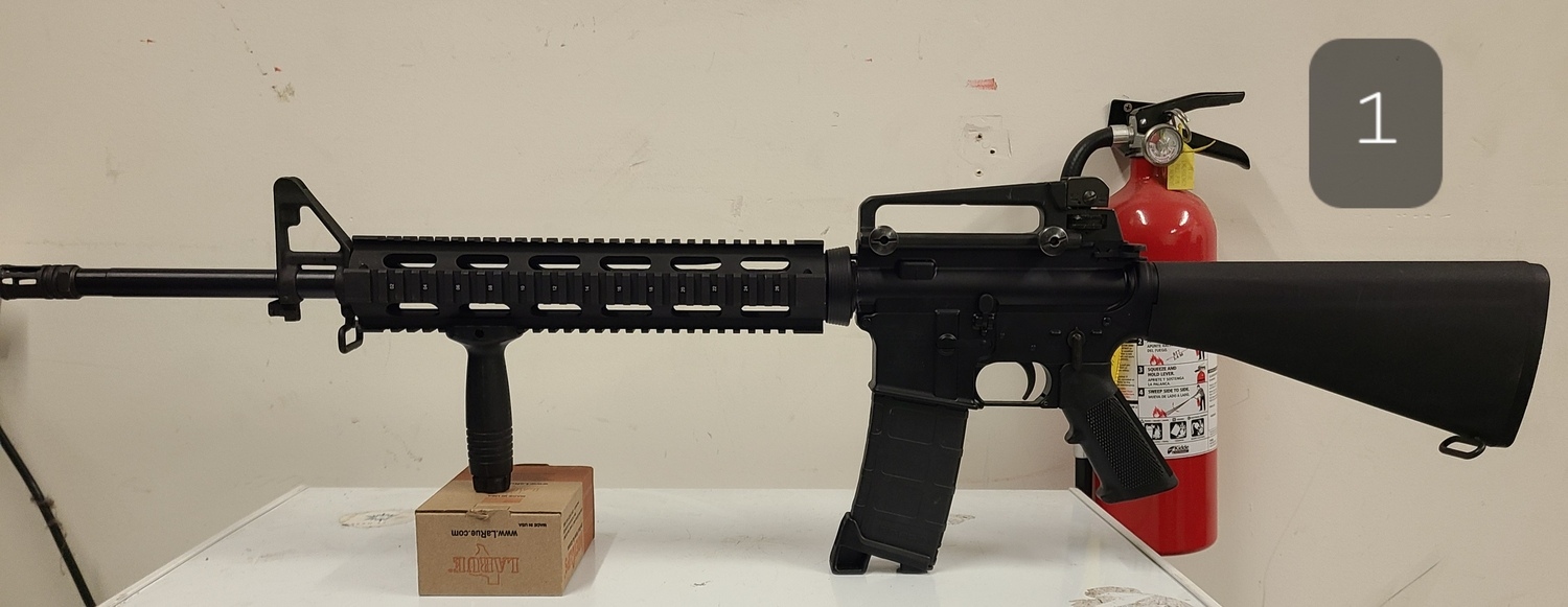 #1 AR-15 5.56mm, 20" barrel, quad rail with pistol grip, carry handle rear sight. A2 rifle stock. Comes with a sling and 2 30-round magazines. $550 or best offer.