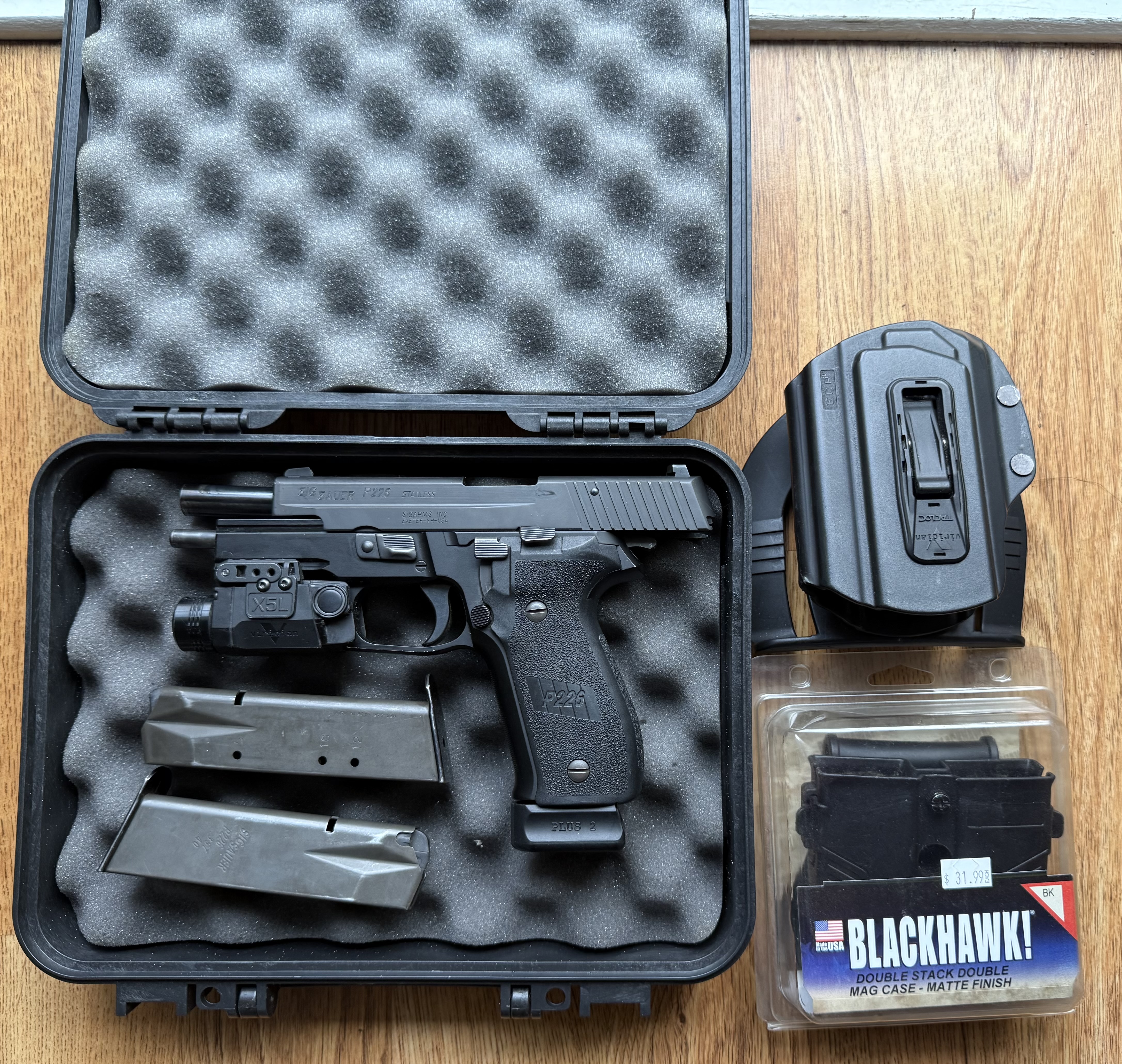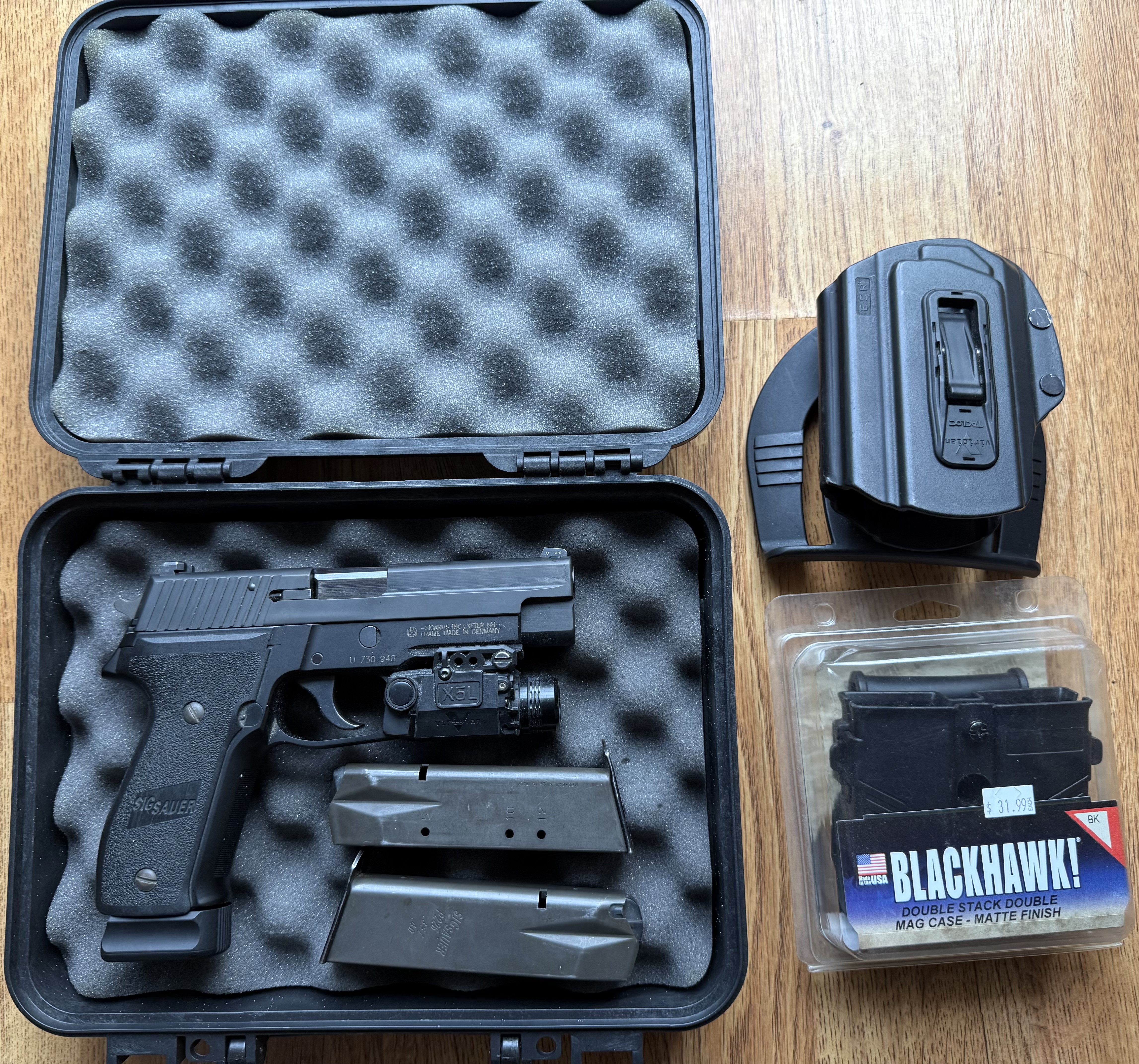 Stainless elite, SIG SAUER P226 40 caliber, with 1/ 15 rd mag, and two 12 rd mags, equipped with a Varidian laser/light combo and tritium night sights. Comes with gun case, BLACKHAWK holster and mag pouch.