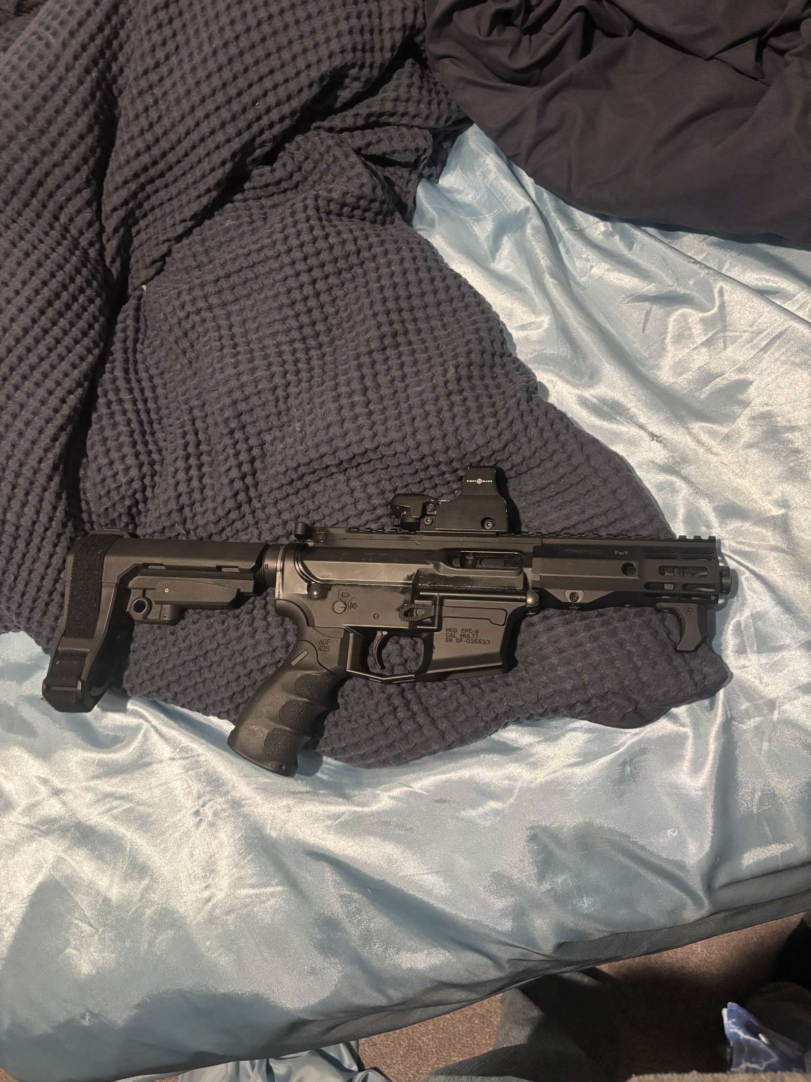 Very clean gun, shot only a few mags. It’s a 5.5 inch barrel chambered in 9mm that’s shoots Glock mags. Comes with everything in picture like the hand stop, folding pistol grip, red dot sight with different modes, and adjustable brace, and 1 10round mag and 1 33round mag. $900obo