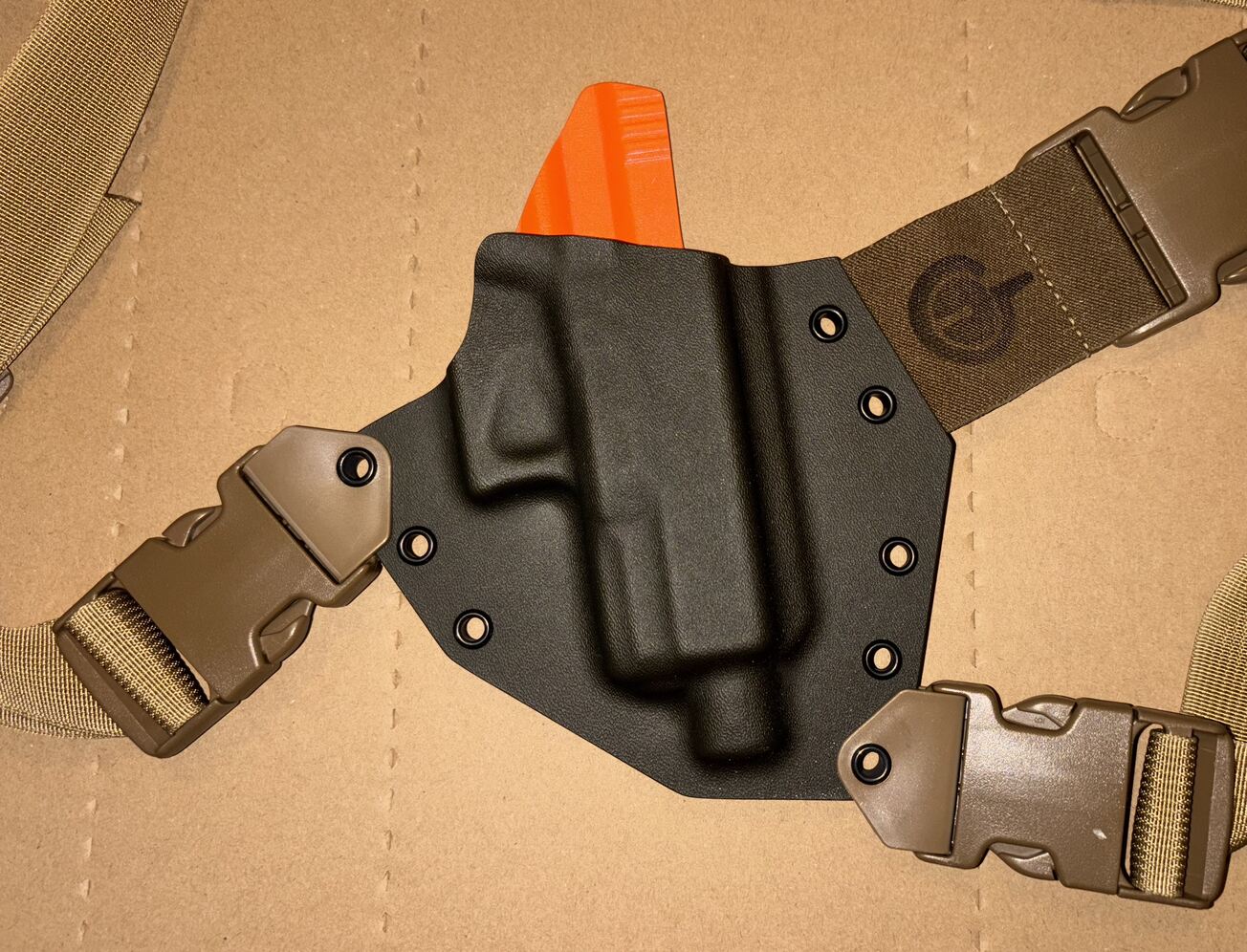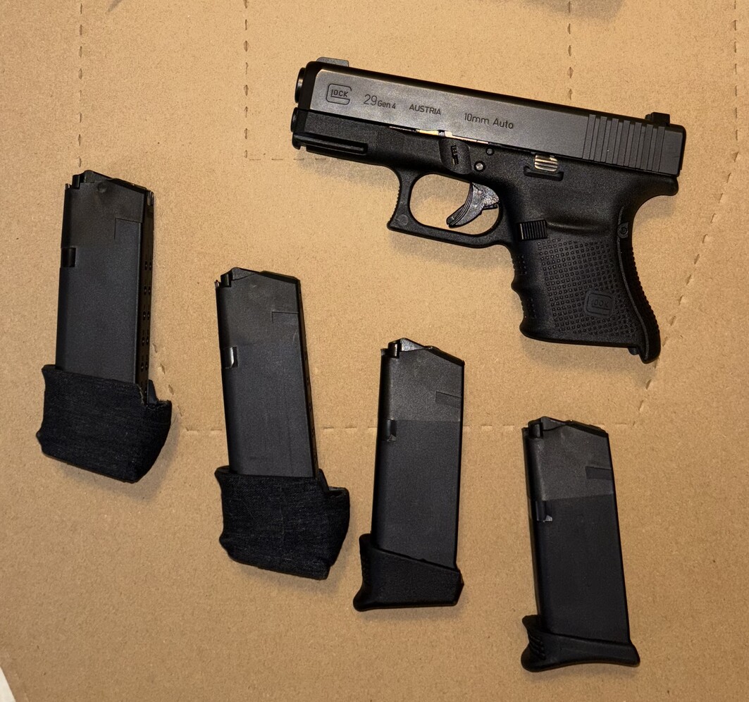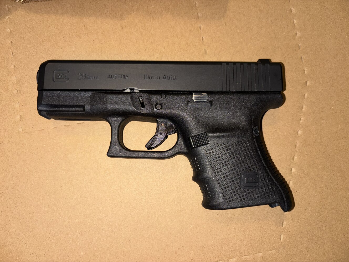 Glock Model 29, Gen 4, now discontinued compact 10mm, with upgraded Trijicon, tritium night sights. Included is a custom ordered Gunfighters, Inc Kenai chest holster, factory Glock box with extra backstraps, and four (4) magazines, a 10 rd, 11 rd, and two 15 rd extended. This makes for lightweight, compact bear protection. Text communication is preferred.
