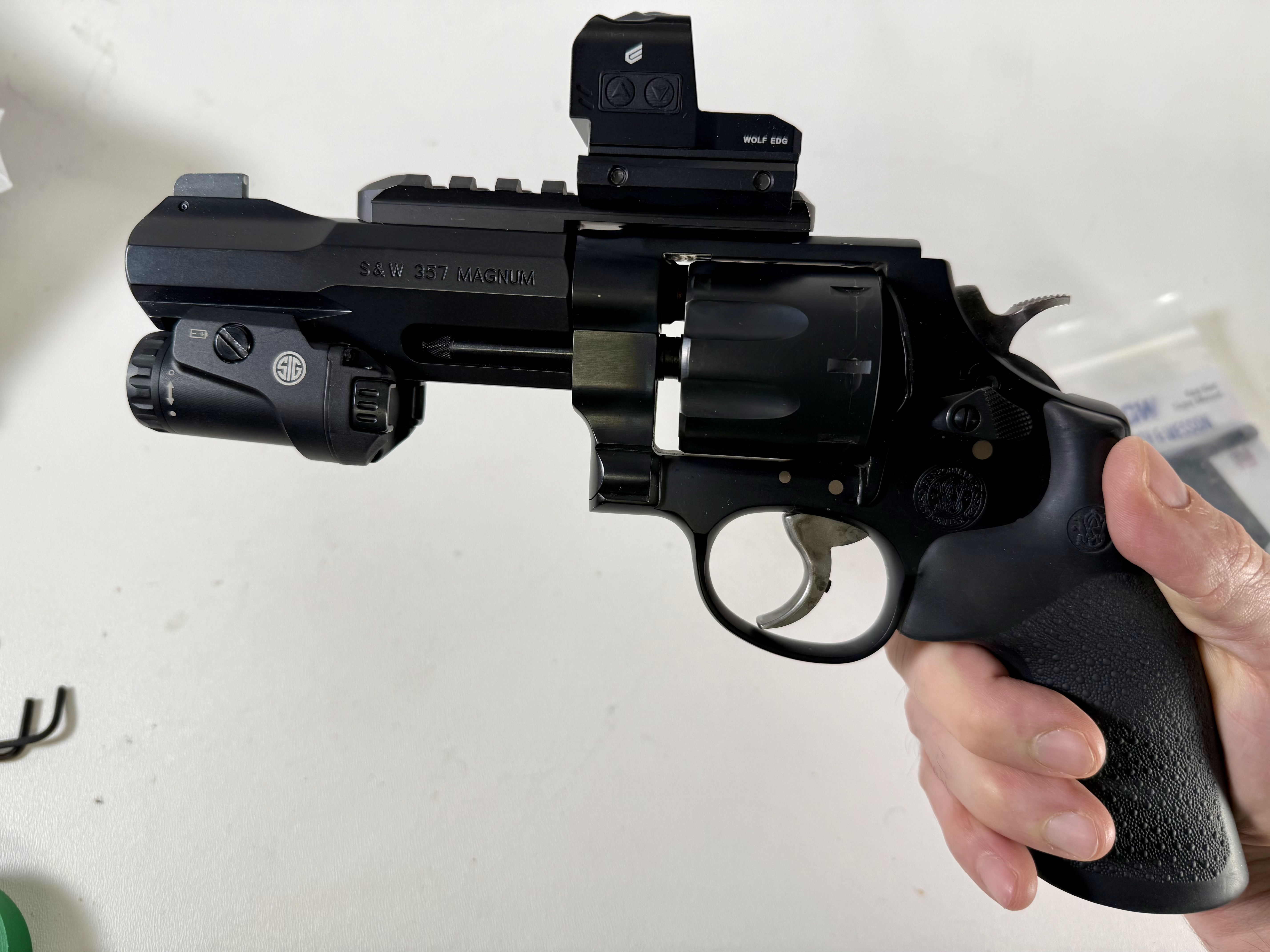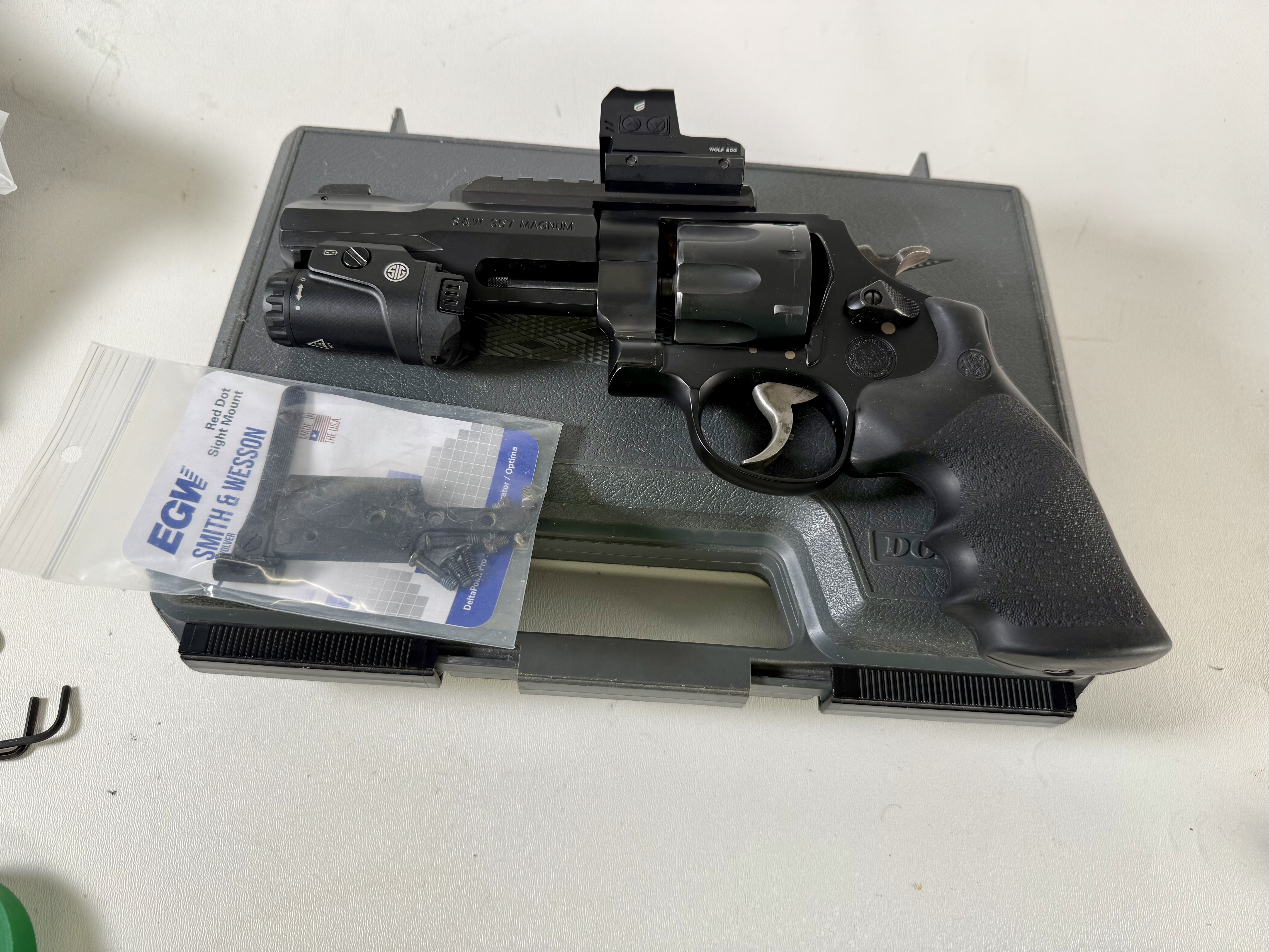I have a S&W TRR8 in 357 magnum. This is a very interesting revolver as it was designed for SWAT teams and carries 8 rounds in the cylinder. It comes with the top rail installed and has a bottom rail for a light. I have included a Cyelee Wolf red dot and an Sig light as you see in the picture. Also comes with a plate for a Delta Point Pro footprint or red dot, that would have the optic sitting much lower than it is now. Must be 21 with no felonies and AK drivers license and willing to sign a bill of sale.