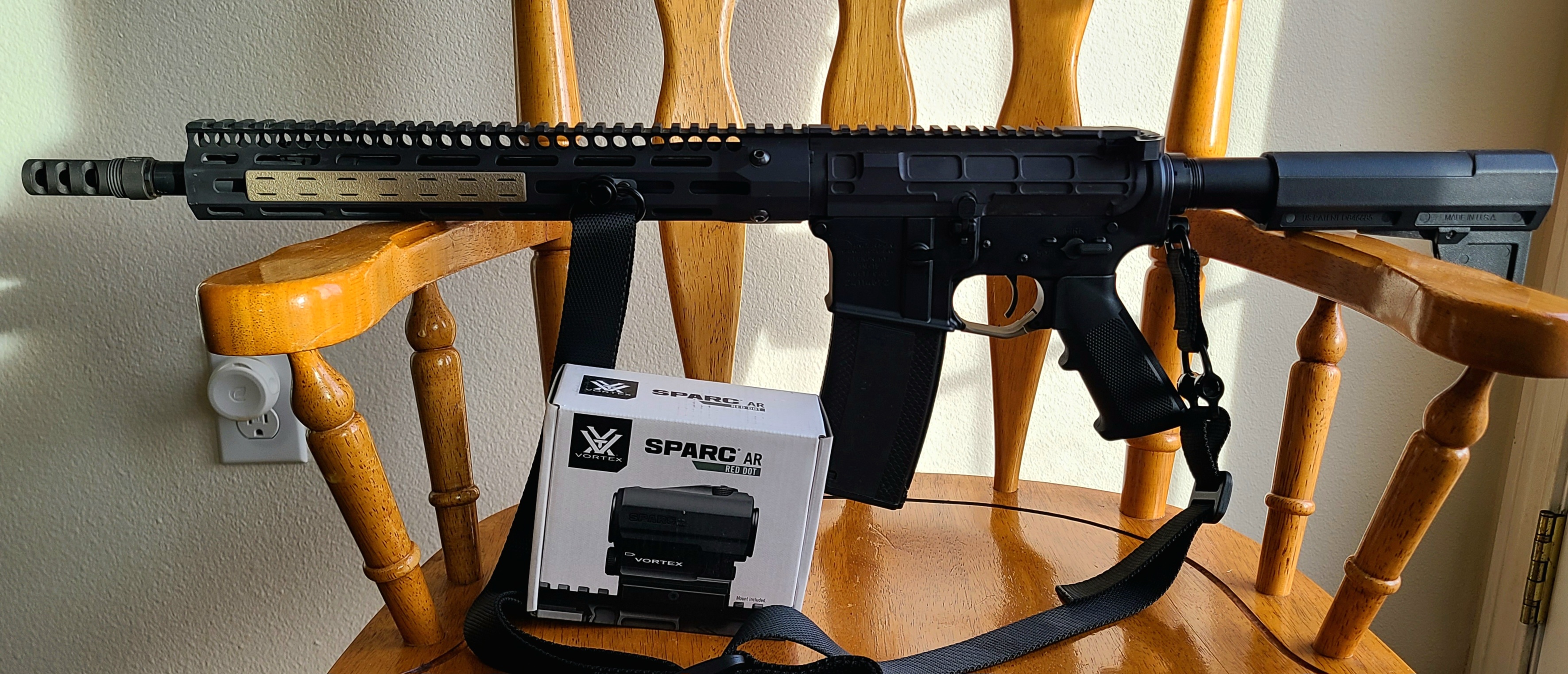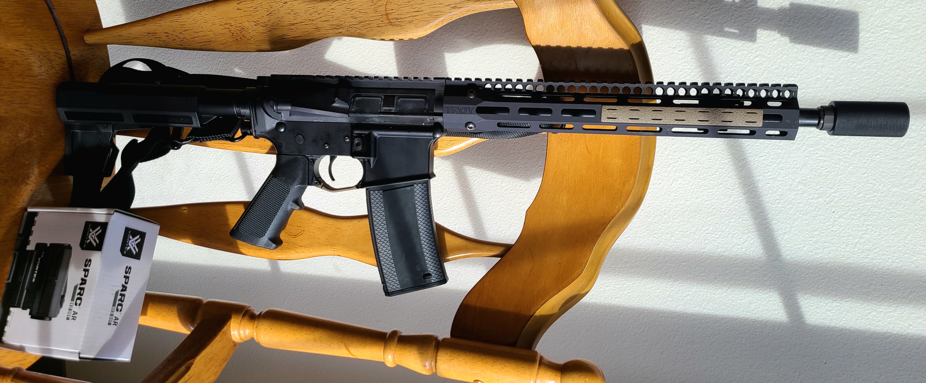 13.9” barrel AR-15 pistol. 13” Troy Mlok free-float tube, and SanTan Tactical billet upper receiver. Ambidextrous charging handle. Aero precision adjustable gas block. Anderson lower receiver with 3.5-pound single stage trigger group and arm brace. Vortex Sparc AR ($200 at cabelas) 2MOA red dot optic included (new in box). Optic takes AAA battery. Comes with 3 mags and a sling. $700 or best offer.