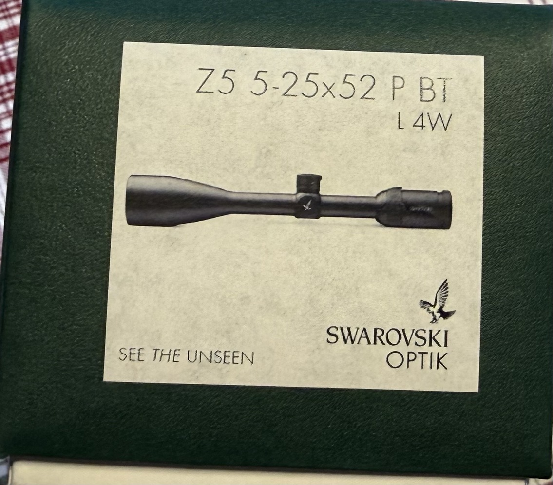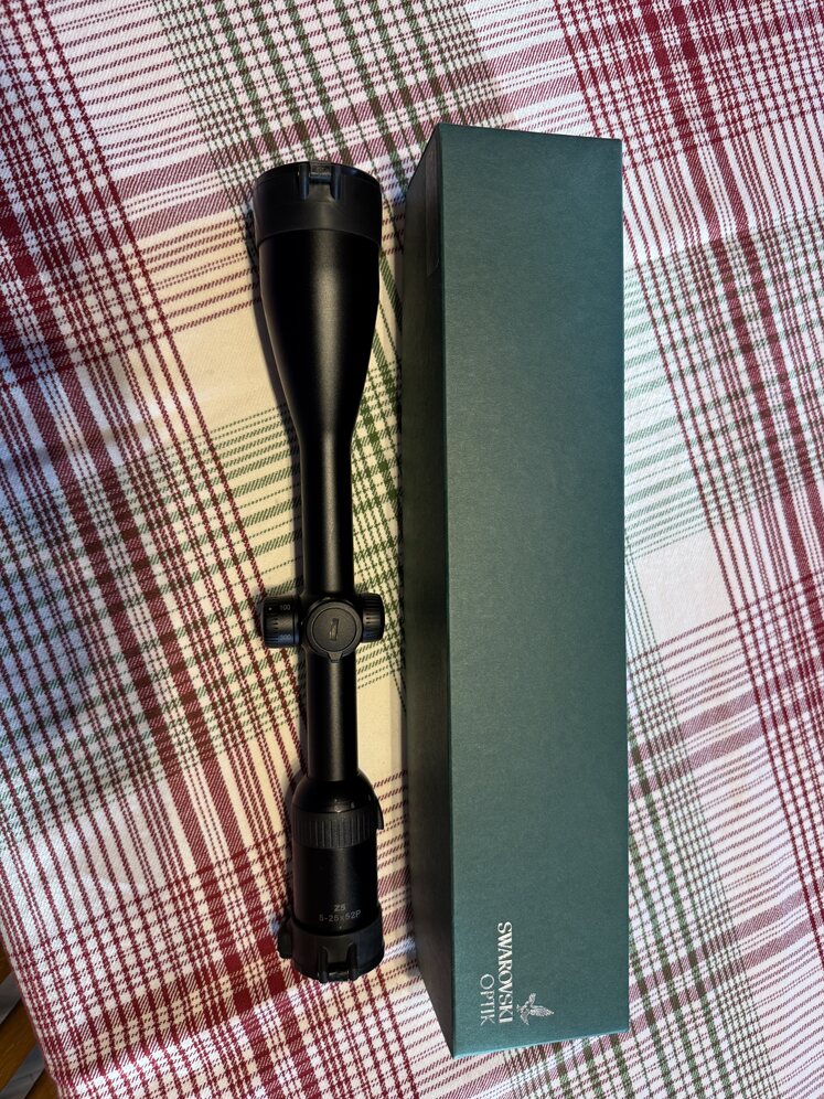 Swarovski Z5 5-25x52 Riflescope. Great optic and incredible glass quality. I am moving and need to get rid of some stuff is the reason why I am selling. This has a 1inch tube and has the ballistic turret on it.