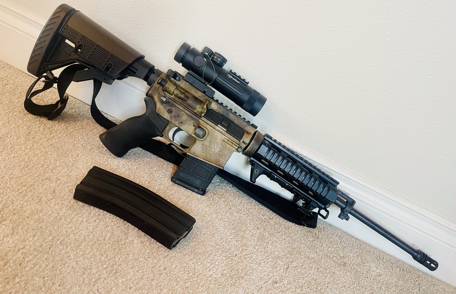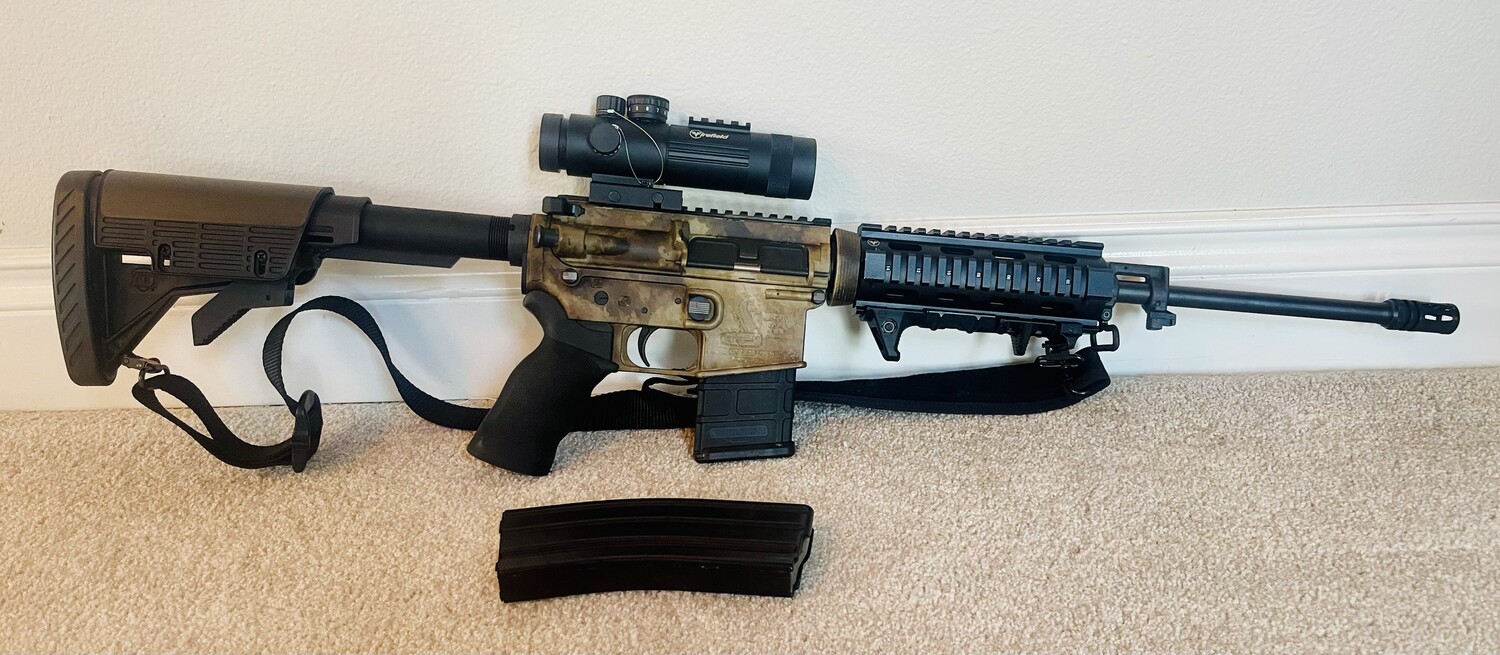 bushmaster carbon-15, multi caliber gun chambered for 223/5.56. The gun comes with a 15 round mag pole magazine and a 30 round steel mag. It has an ego rubber grip, The butt-stock has adjustable cheek pad, scope is just a five by magnifier with multilevel red illumination, the rifle has a upgraded heavy buffer spring and H1 buffer. shoots very well probably has about 400 rounds through. $500.00